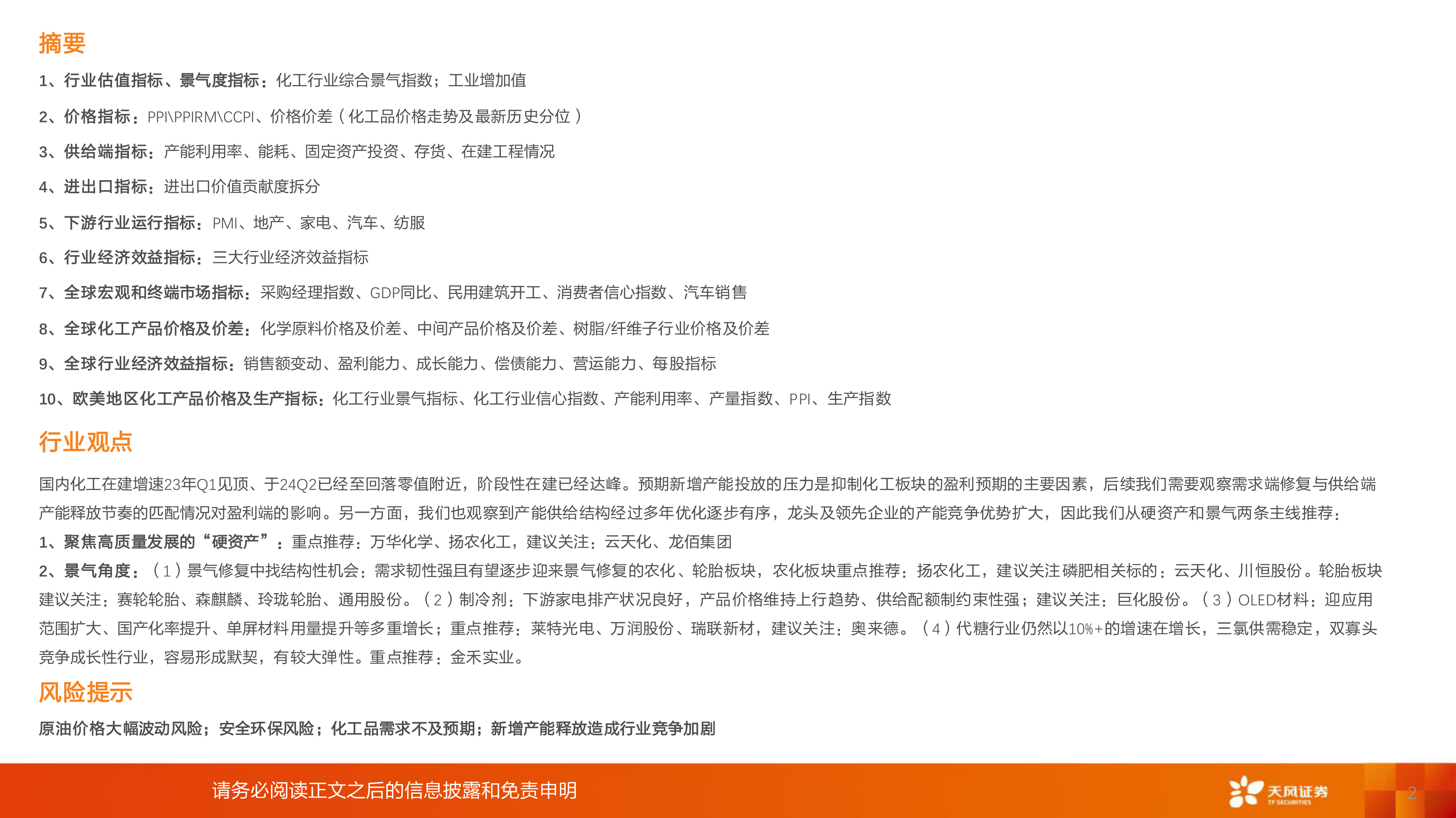 本报告通过对化工行业运行指标的跟踪分析,从多个维度评估行业现状及未来走势。主要内容包括: