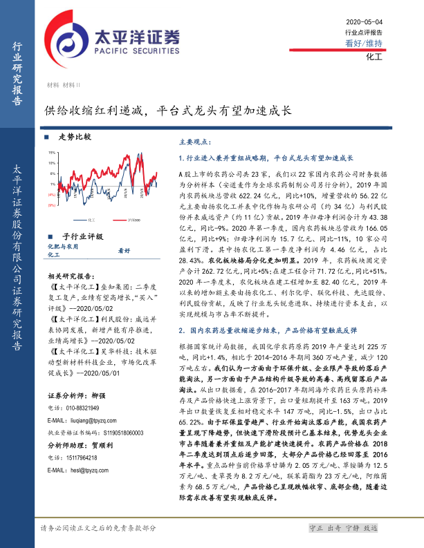 本报告的核心观点是:中国农药行业正经历兼并重组,龙头企业有望加速成长。供给侧改革红利递减,但农产品价格企稳和全球农化需求弱复苏,以及中化集团与中国化工合并带来的新机遇,将推动行业龙头企业进一步发展。报告重点推荐扬农化工、利民股份、利尔化学和中旗股份四家公司。