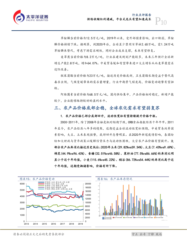报告分析了全球农产品价格和库存情况,指出大部分农产品库消比接近历史低位,价格有望提升。同时,报告分析了拜耳和安道麦两家全球农化巨头的经营情况,指出全球农化市场受到新冠疫情的影响,但部分产品需求依然强劲。