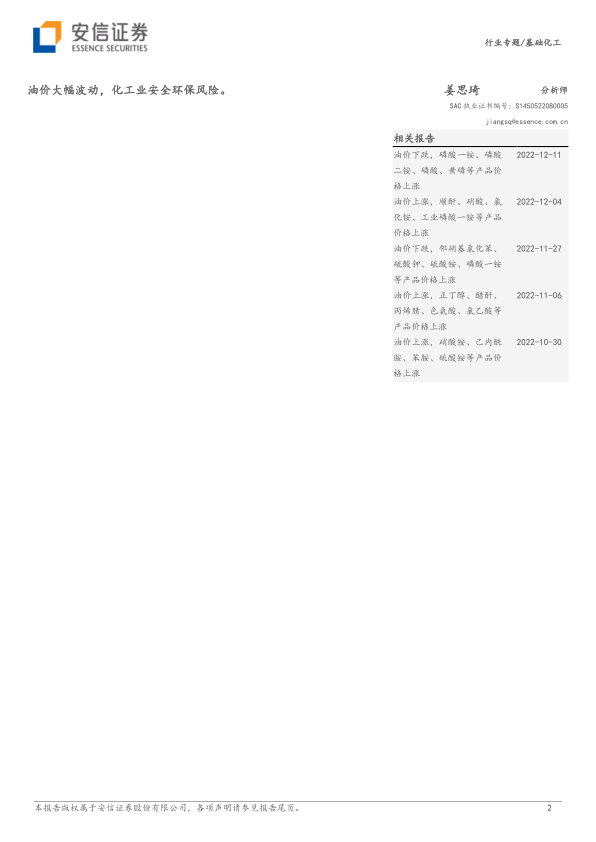 报告首先分析了2022年化工大宗商品价格与价差的错位现象,指出大宗商品价格高位运行,但价差却处于历史低位。这主要源于原油价格高位运行带来的成本端支撑,以及内需疲软、外需走弱导致的需求下降和库存积压。报告认为,短期内弱现实持续,行业反转需要等待价格触底。