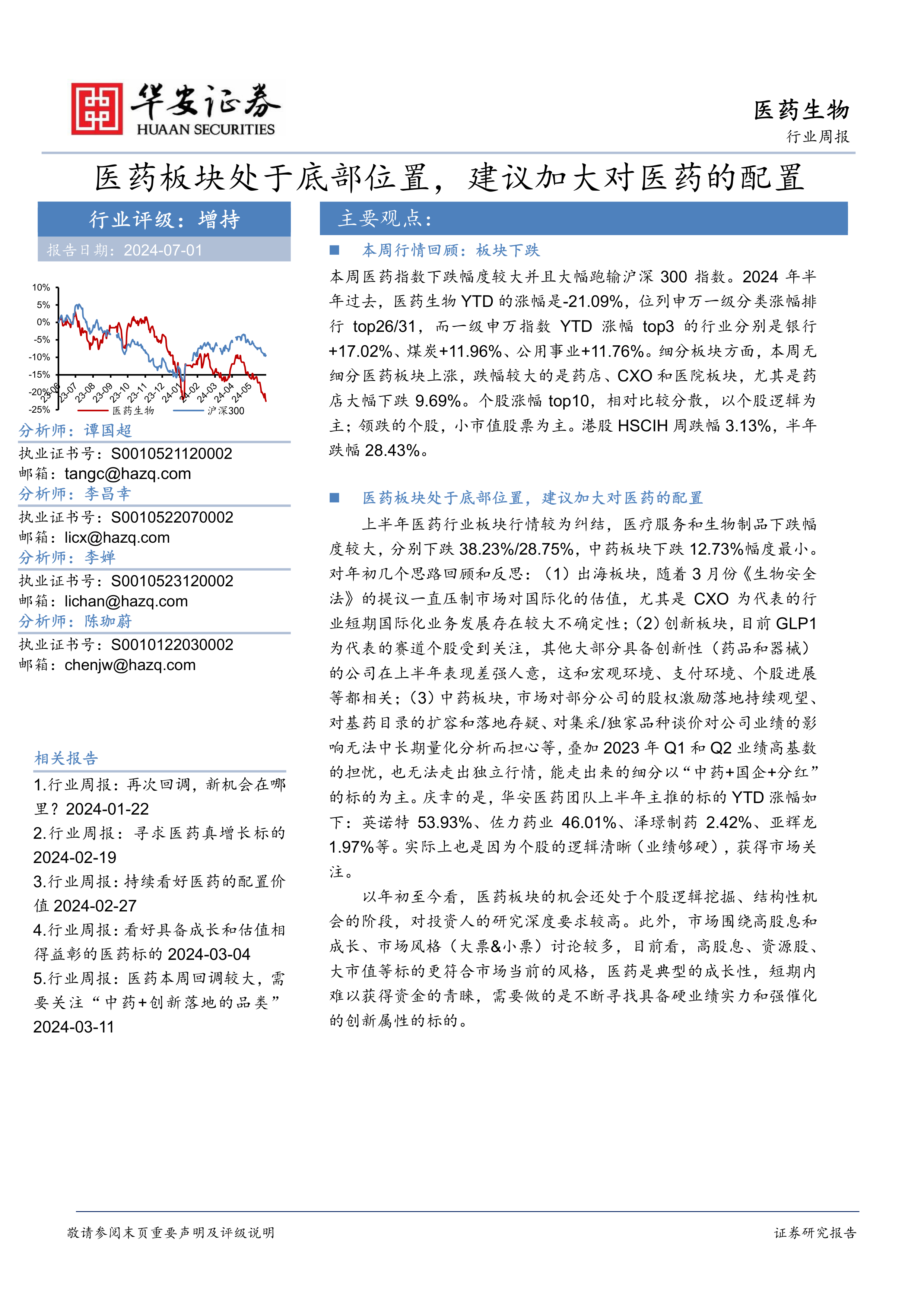 本报告的核心观点是:医药板块目前处于底部位置,建议投资者加大对医药板块的配置。这一观点基于以下几个方面的分析: