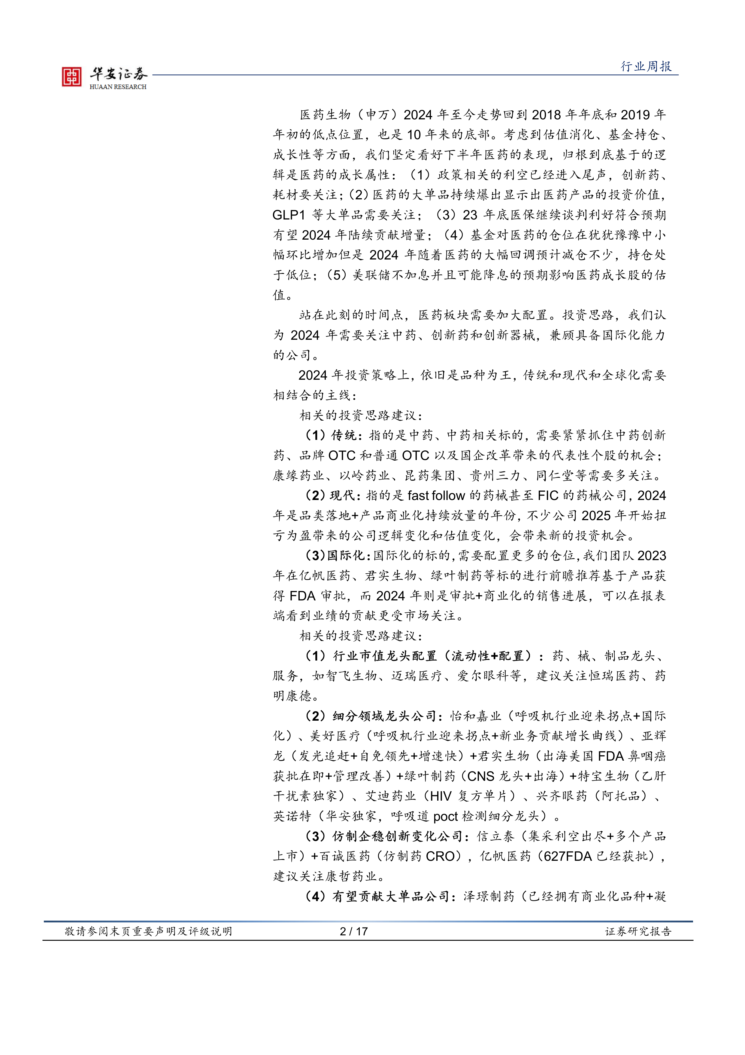 报告坚定看好下半年医药板块的表现,并基于以下逻辑:政策利空因素接近尾声;医药大单品持续涌现;医保谈判利好结果;基金持仓处于低位;美联储可能降息。报告建议投资者加大对医药板块的配置,并提出了具体的投资策略,包括关注中药、创新药和创新器械,以及兼顾具备国际化能力的公司。 投资策略建议涵盖了传统中药、现代药械(Fast follow和FIC)、国际化标的,以及细分领域龙头公司、仿制药企、大单品公司等多个方面,并列举了具体的公司案例。