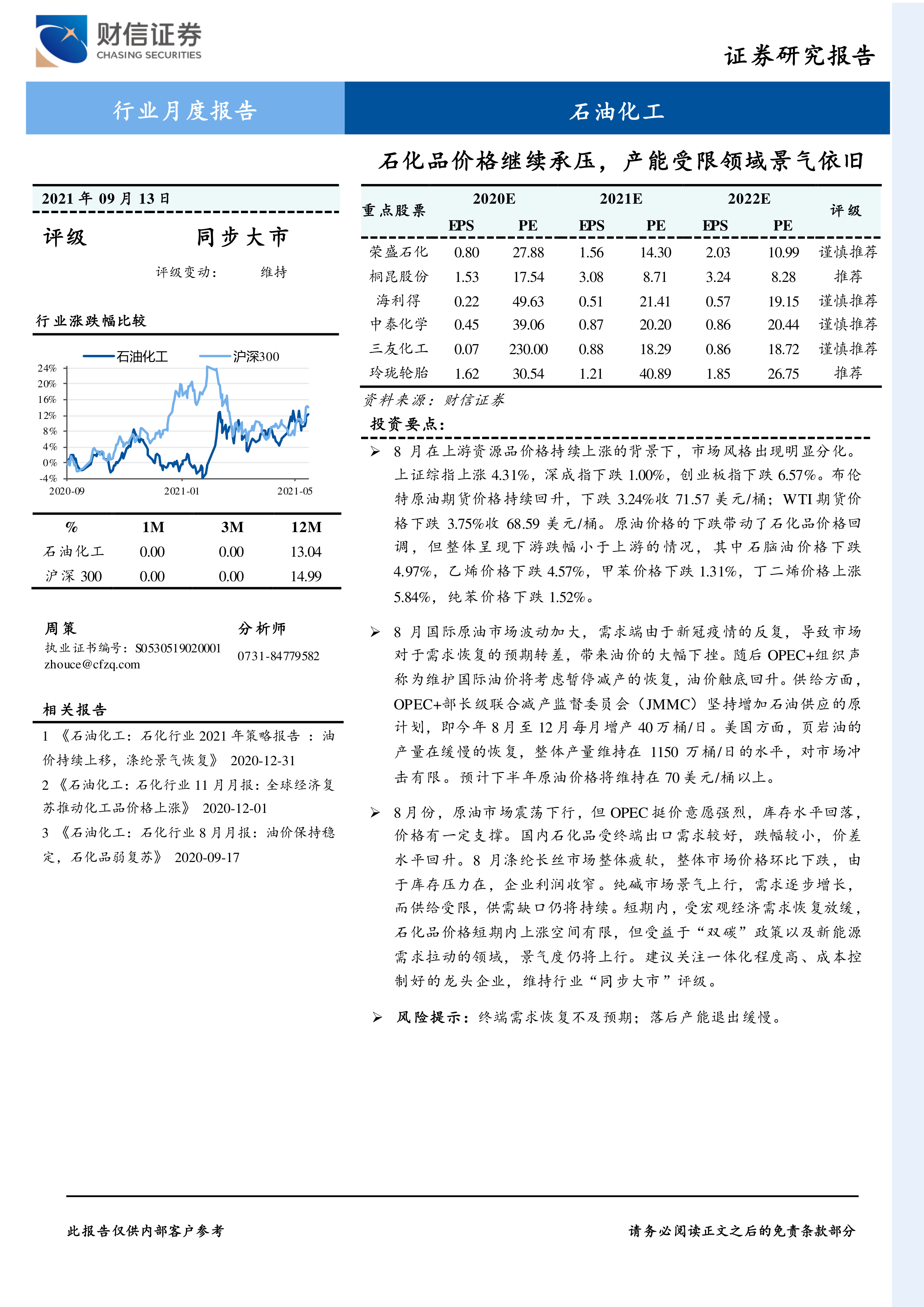 本报告的核心观点是:2021年8月,石油化工行业市场风格出现明显分化,上游资源品价格持续上涨,但原油价格下跌带动石化品价格回调,下游跌幅小于上游。受宏观经济需求恢复放缓影响,石化品价格短期上涨空间有限,但“双碳”政策和新能源需求将推动部分领域景气度上行。建议关注一体化程度高、成本控制好的龙头企业,维持行业“同步大市”评级。