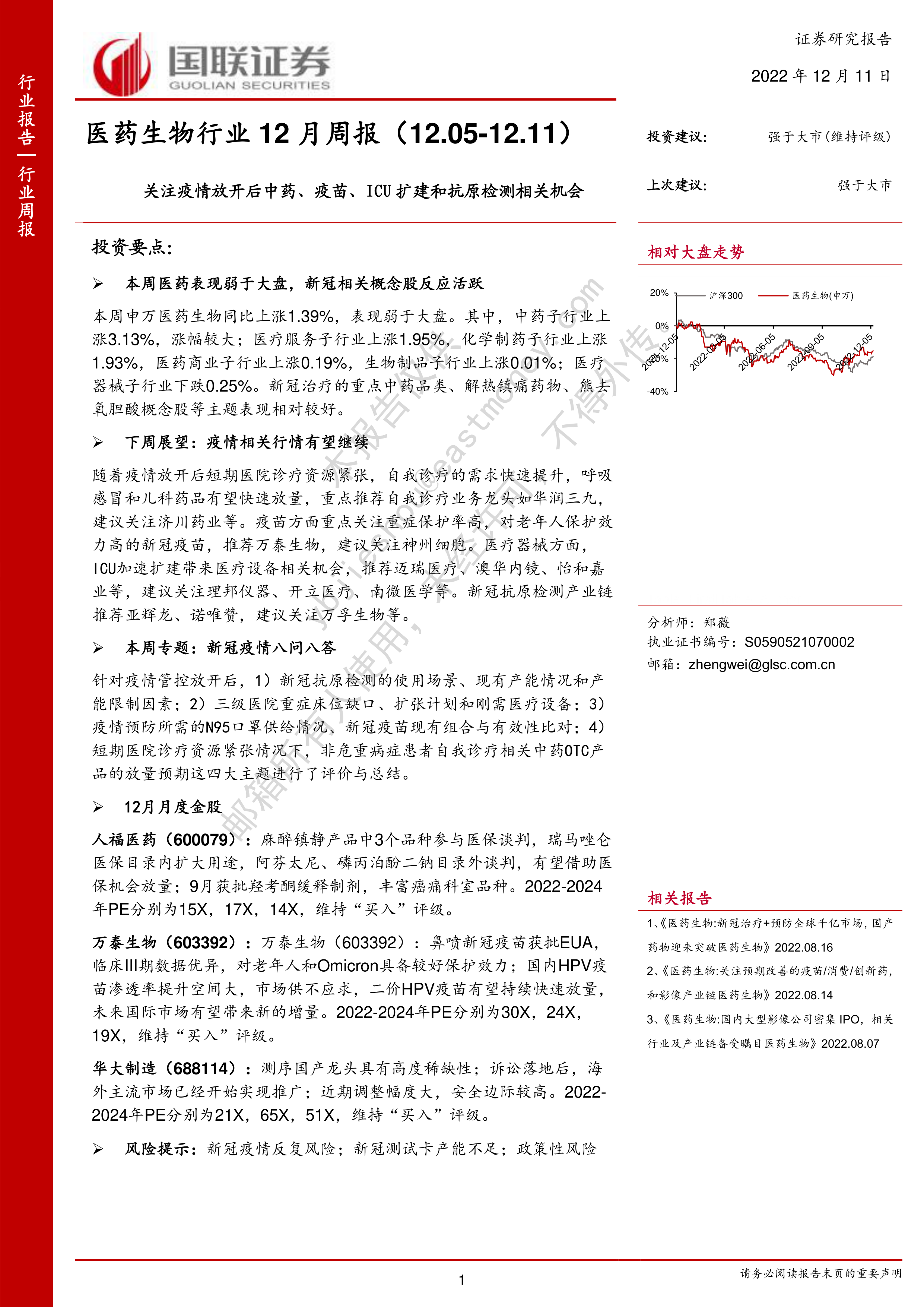 医药生物行业12月周报:关注疫情放开后中药、疫苗、ICU扩建和抗原检测相关机会