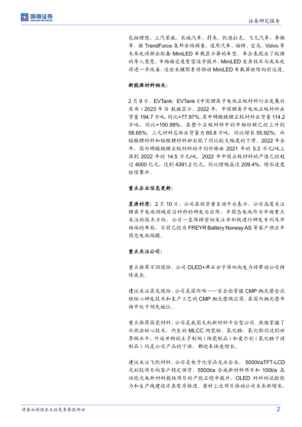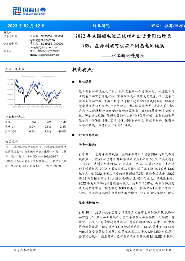 化工新材料周报:2022年我国锂电池正极材料出货量同比增长78%,星源材质可供应半固态电池隔膜