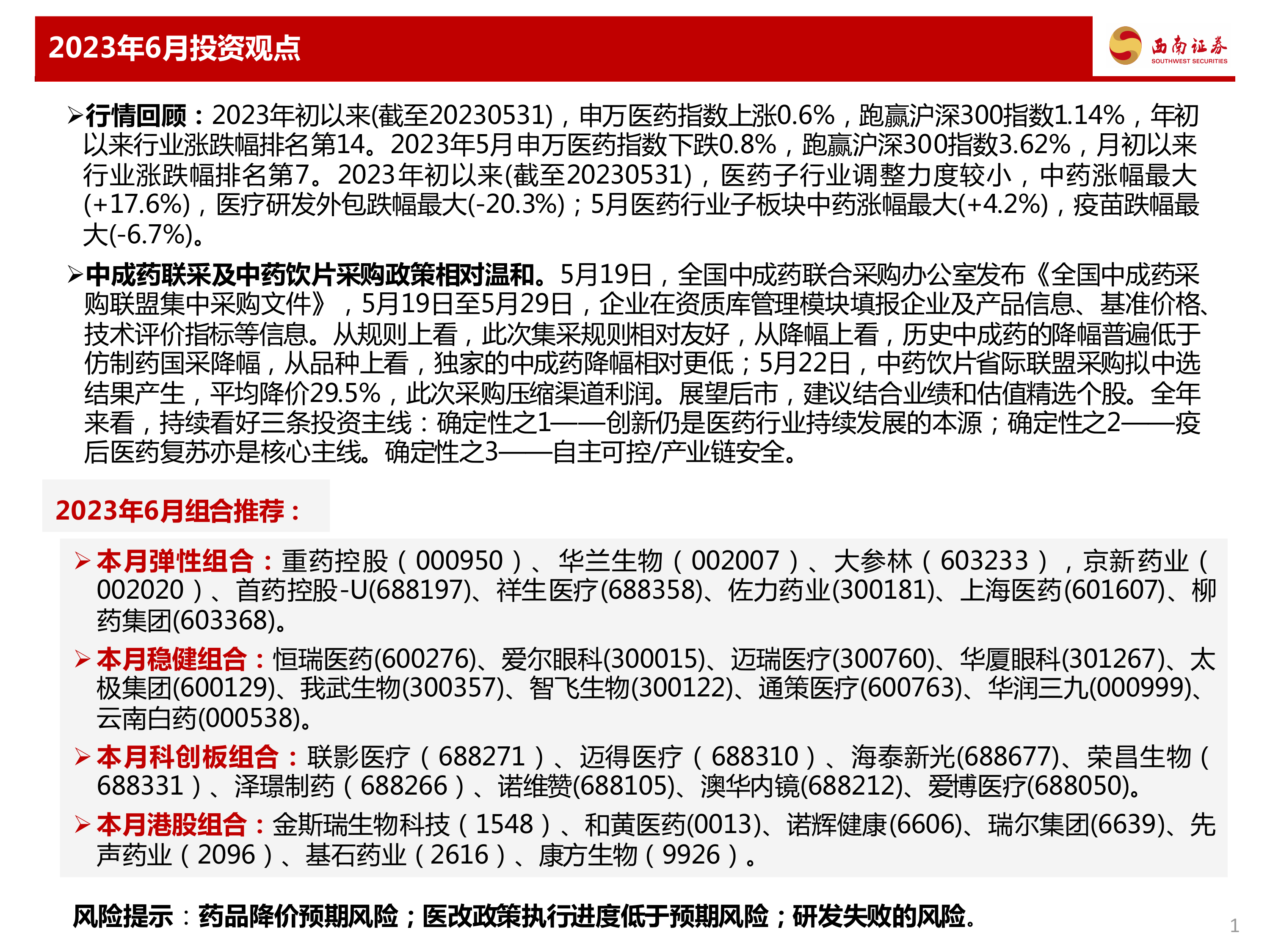 本报告的核心观点是:2023年6月医药行业业绩分化显著,建议投资者结合业绩和估值,精选个股进行投资。报告指出,中成药联采及中药饮片采购政策相对温和,利好中药板块;同时,持续看好创新、疫后复苏和产业链安全三条投资主线。报告还提供了本月弹性组合、稳健组合、科创板组合和港股组合的推荐个股。