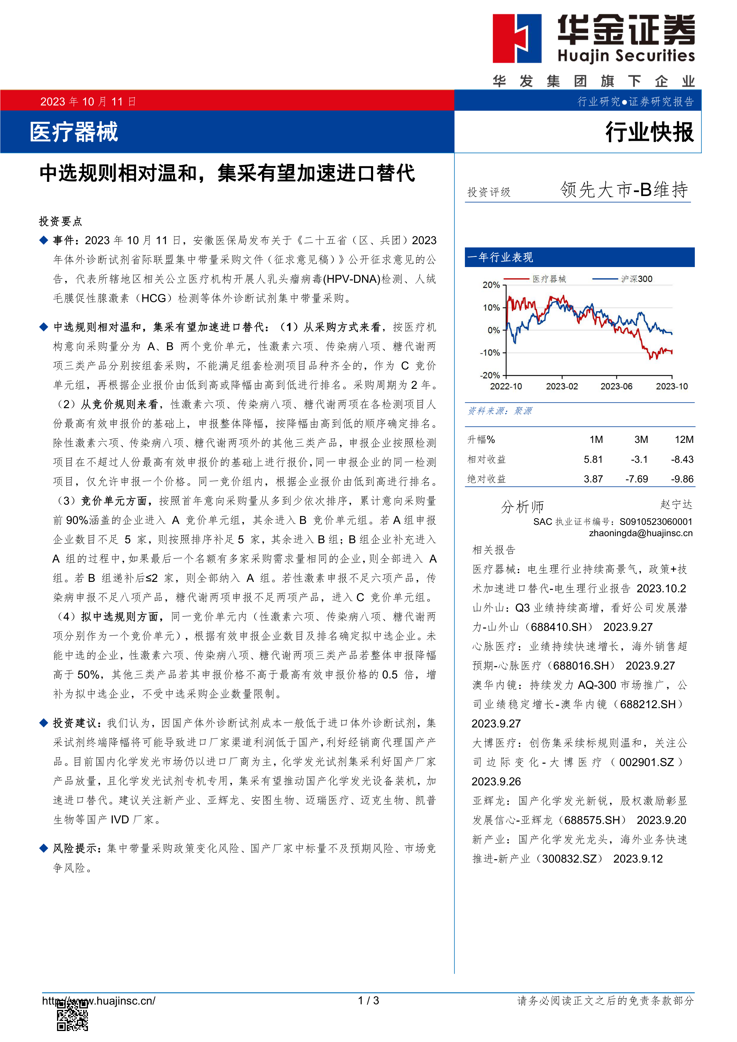 事件:2023年10月11日,安徽医保局发布关于《二十五省(区、兵团)2023年体外诊断试剂省际联盟集中带量采购文件(征求意见稿)》公开征求意见的公告,代表所辖地区相关公立医疗机构开展人乳头瘤病毒(HPV-DNA)检测、人绒毛膜促性腺激素(HCG)检测等体外诊断试剂集中带量采购。