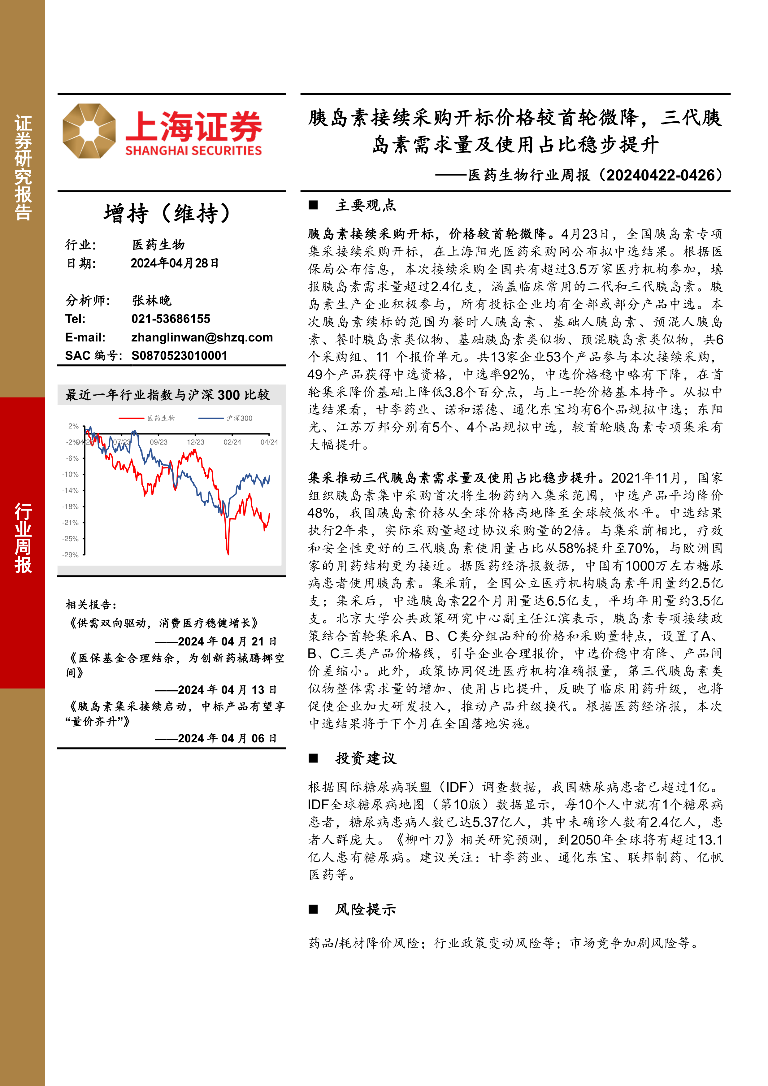 医药生物行业周报:胰岛素接续采购开标价格较首轮微降,三代胰岛素需求量及使用占比稳步提升