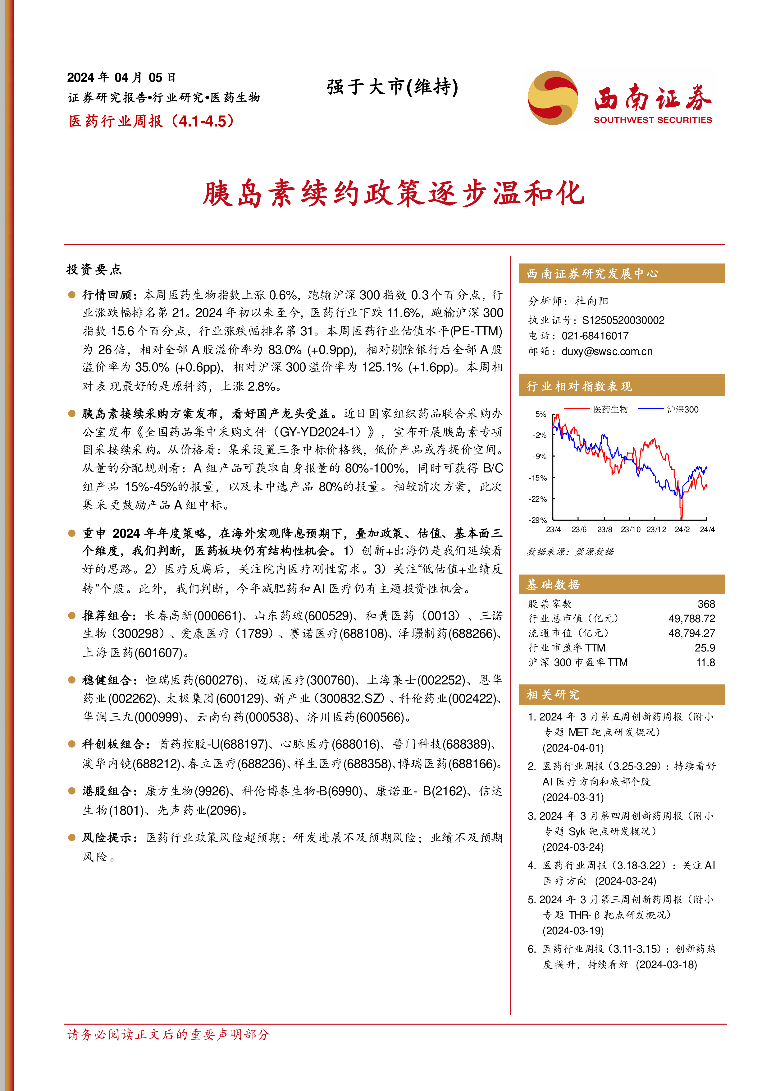 本报告的核心观点是:尽管2024年初以来医药行业表现弱于大盘,但基于海外宏观降息预期以及政策、估值、基本面等多维度因素的综合分析,西南证券认为医药板块仍存在结构性投资机会。报告重点关注创新+出海、医疗反腐后的院内医疗刚性需求以及低估值+业绩反转个股,并看好减肥药和AI医疗的主题投资机会。 同时,报告详细分析了本周医药行业二级市场表现,包括行业指数、个股涨跌、资金流向、融资融券等数据,并对推荐组合、稳健组合、科创板组合和港股组合进行了业绩分析和展望。 胰岛素接续采购方案的发布,被认为利好国产龙头企业。