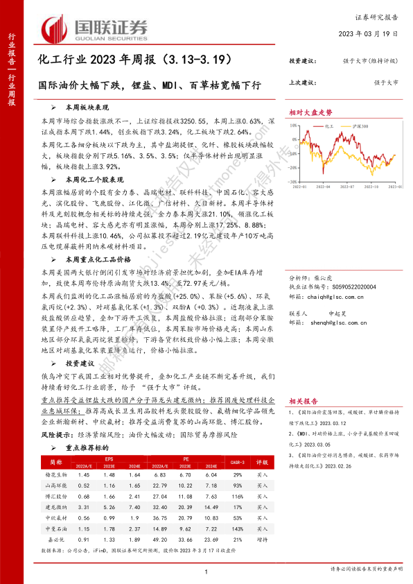 化工行业2023年周报:国际油价大幅下跌,锂盐、MDI、百草枯宽幅下行