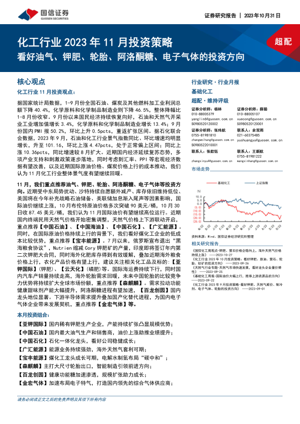 11月,我们重点推荐油气、钾肥、轮胎、阿洛酮糖、电子气体等投资方向。近期受中东局势扰动、沙特持续自愿额外减产、库存依旧维持低位、美国将在今年补充战略石油储备、美联储加息渐入尾声等因素影响,国际油价继续上涨,10月布伦特原油价格多次突破90美元/桶,10月30日收87.45美元/桶,我们认为11月国际油价有望继续高位运行。近期国内终端民用天然气价格开始密集调整,天然气价格上下游联动开启,重点推荐【中国石油】、【中国海油】、【中国石化】、【广汇能源】。同时,在国际原油价格持续上行的背景下,我们看好煤化工企业的低成本比较优势,重点推荐【宝丰能源】。7月以来,俄罗斯宣布退出“黑海粮食协议”,Nutrien缩减Cory钾肥矿的产量,印度即将签订年内第二次钾肥大合同,同时海外化肥库存得到有效缓解,叠加近期海外粮食价格上行,农化产品价格有望上行,建议关注相关化工品及标的:【亚钾国际】(钾肥)、【云天化】(磷肥)等。国际海运费持续下行,同时国内汽车产销量持续走高,海外轮胎需求回暖,未来中国轮胎的比较竞争力优势将持续扩大全球市场份额,重点推荐【森麒麟】。需求拉动功能健康甜味剂产能大幅提升,阿洛酮糖进程有望加速,【百龙创园】国内龙头地位显著。下游半导体需求提升叠加国产化替代进程,为国内电子气体企业带来发展契机,重点推荐【金宏气体】等。