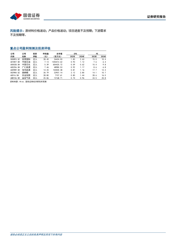 风险提示:原材料价格波动;产品价格波动;项目进度不及预期;下游需求不及预期等。