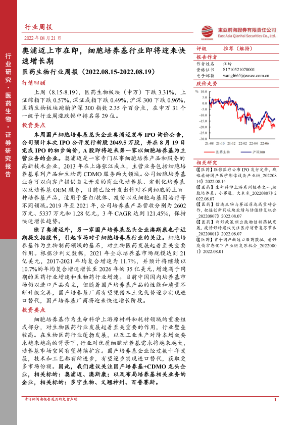 医药生物行业周报:奥浦迈上市在即,细胞培养基行业即将迎来快速增长期