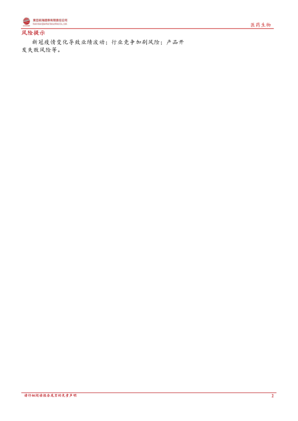 报告最后列出了投资风险提示,包括新冠疫情变化导致业绩波动风险、行业竞争加剧风险以及产品开发失败风险。