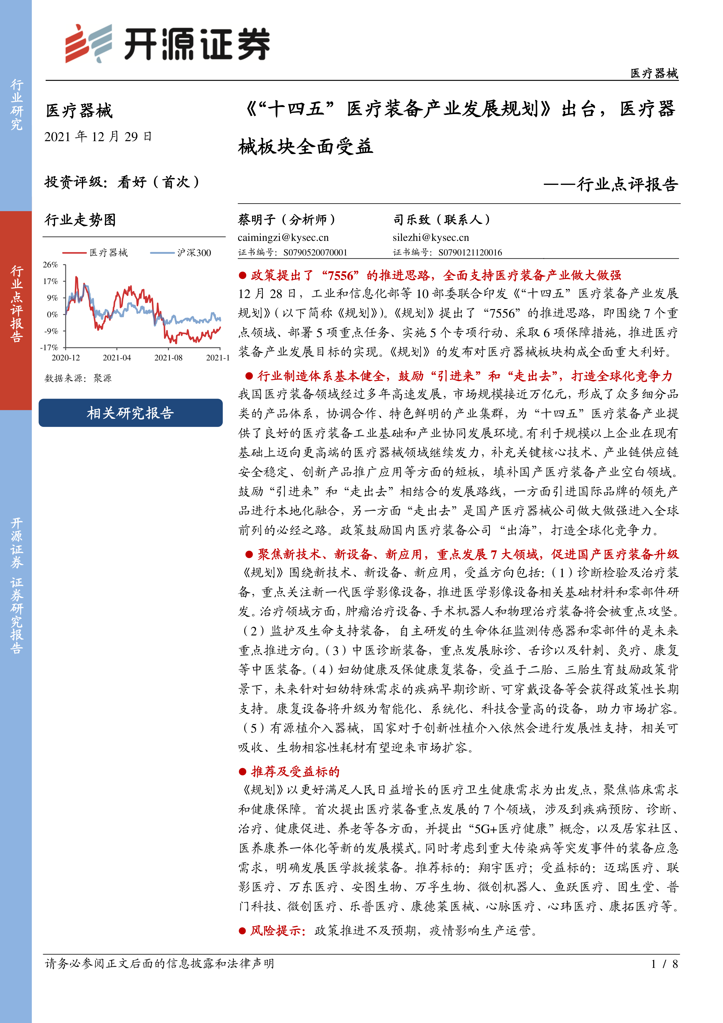 这份报告对中国医疗器械行业在《“十四五”医疗装备产业发展规划》背景下的发展前景进行了深入分析。报告认为,该规划的出台为行业发展带来了重大机遇,中国医疗器械行业拥有良好的发展环境和巨大的发展潜力。 报告重点分析了七大重点发展领域,并推荐了一系列受益标的,为投资者提供了有价值的参考信息。 然而,报告也指出了政策推进不及预期和疫情影响生产运营等潜在风险。 投资者在进行投资决策时,应充分考虑这些风险因素,并进行独立的判断。