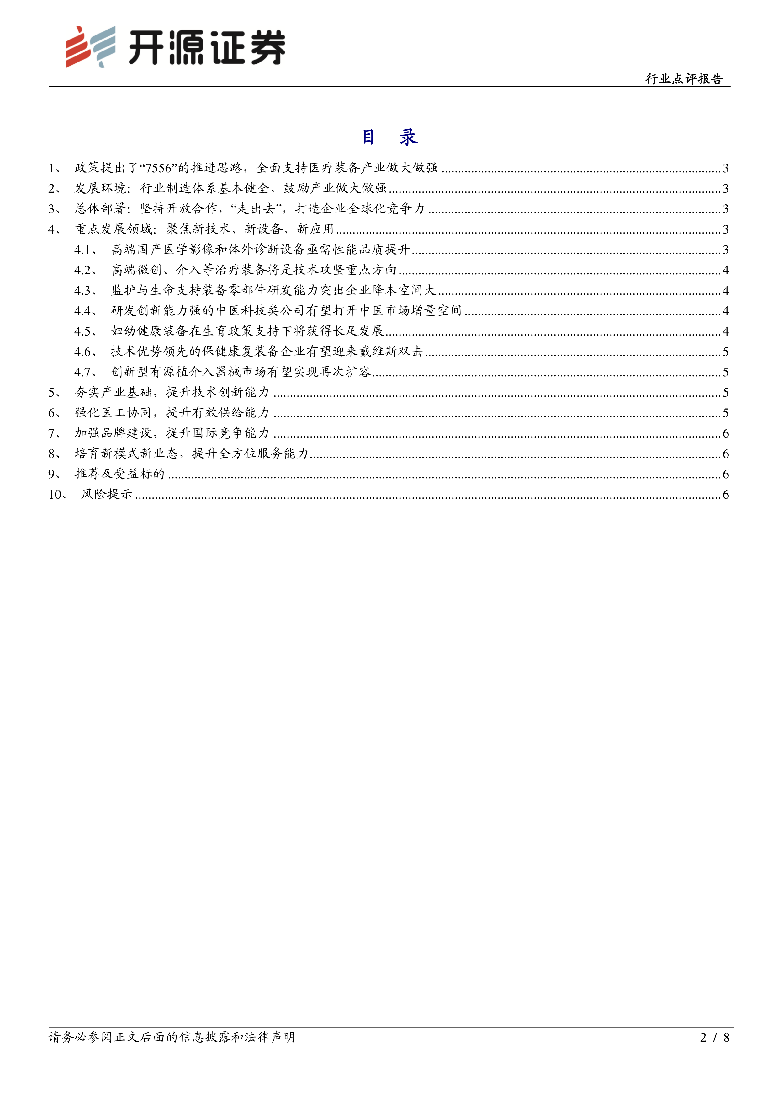 这份开源证券发布的医疗器械行业点评报告,核心观点是《“十四五”医疗装备产业发展规划》的出台为医疗器械板块带来了重大利好。报告基于规划中提出的“7556”推进思路(围绕7个重点领域、部署5项重点任务、实施5个专项行动、采取6项保障措施),对中国医疗器械行业的发展现状、未来趋势以及投资机会进行了深入分析。报告认为,中国医疗器械行业发展环境良好,具备全球竞争力,并重点推荐了7大重点发展领域中的投资机会,以及相应的受益标的。