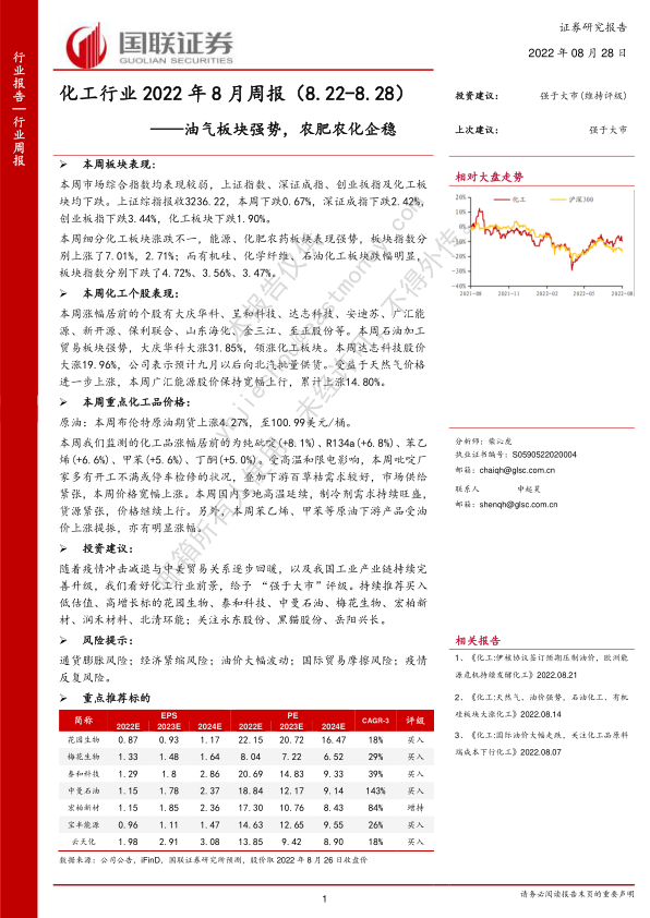 化工行业2022年8月周报:油气板块强势,农肥农化企稳