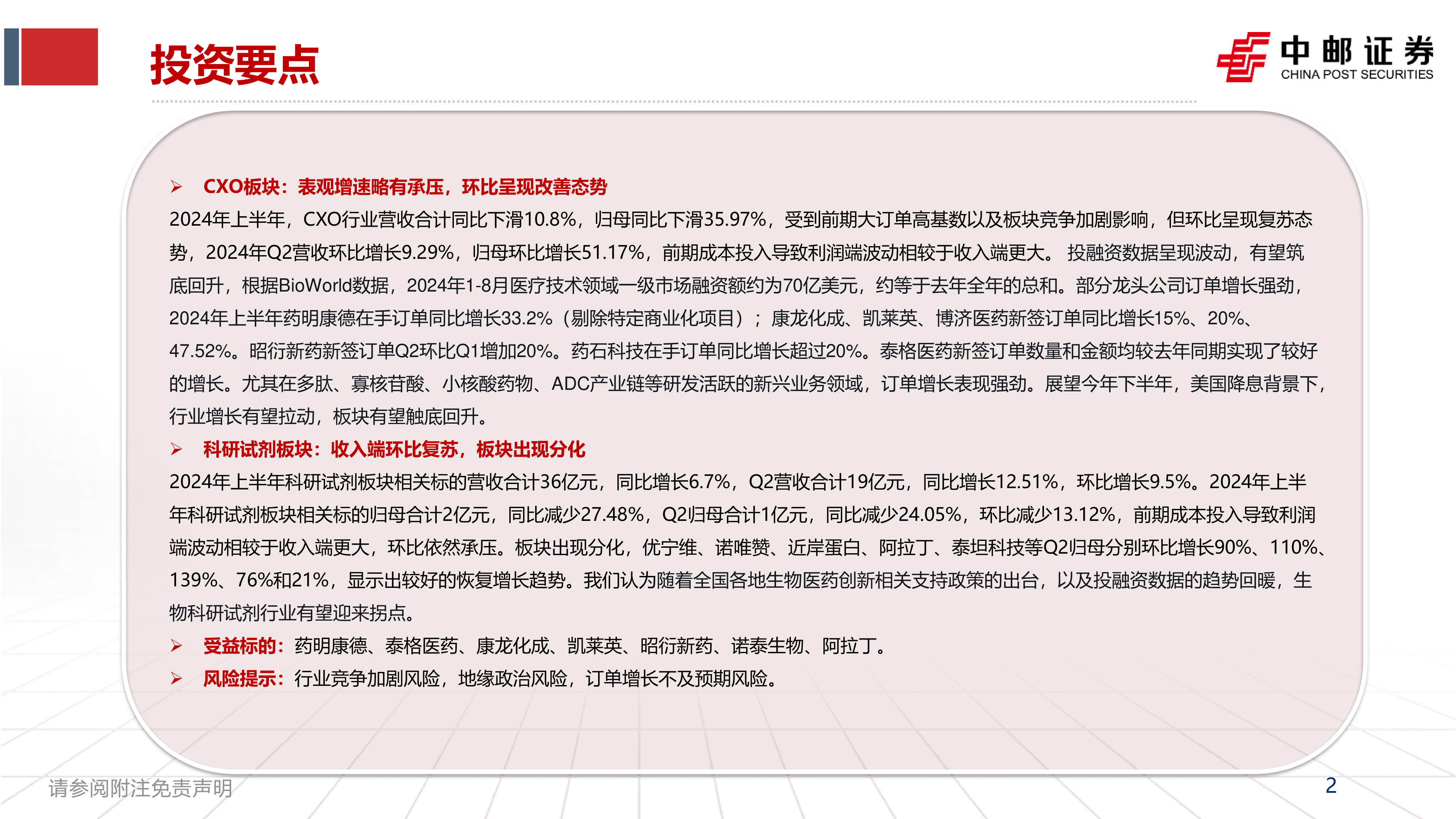 本报告基于公开数据对2024年上半年CXO和科研试剂行业进行了分析。CXO板块虽然营收和利润同比下滑,但环比改善,龙头企业订单增长强劲,新兴业务发展迅猛;科研试剂板块收入环比复苏,但利润端承压,板块出现分化,部分企业展现复苏趋势。整体来看,行业发展呈现分化态势,但部分企业和细分领域增长强劲,行业有望触底回升。 投资者需关注行业竞争加剧、地缘政治风险以及订单增长不及预期等风险。