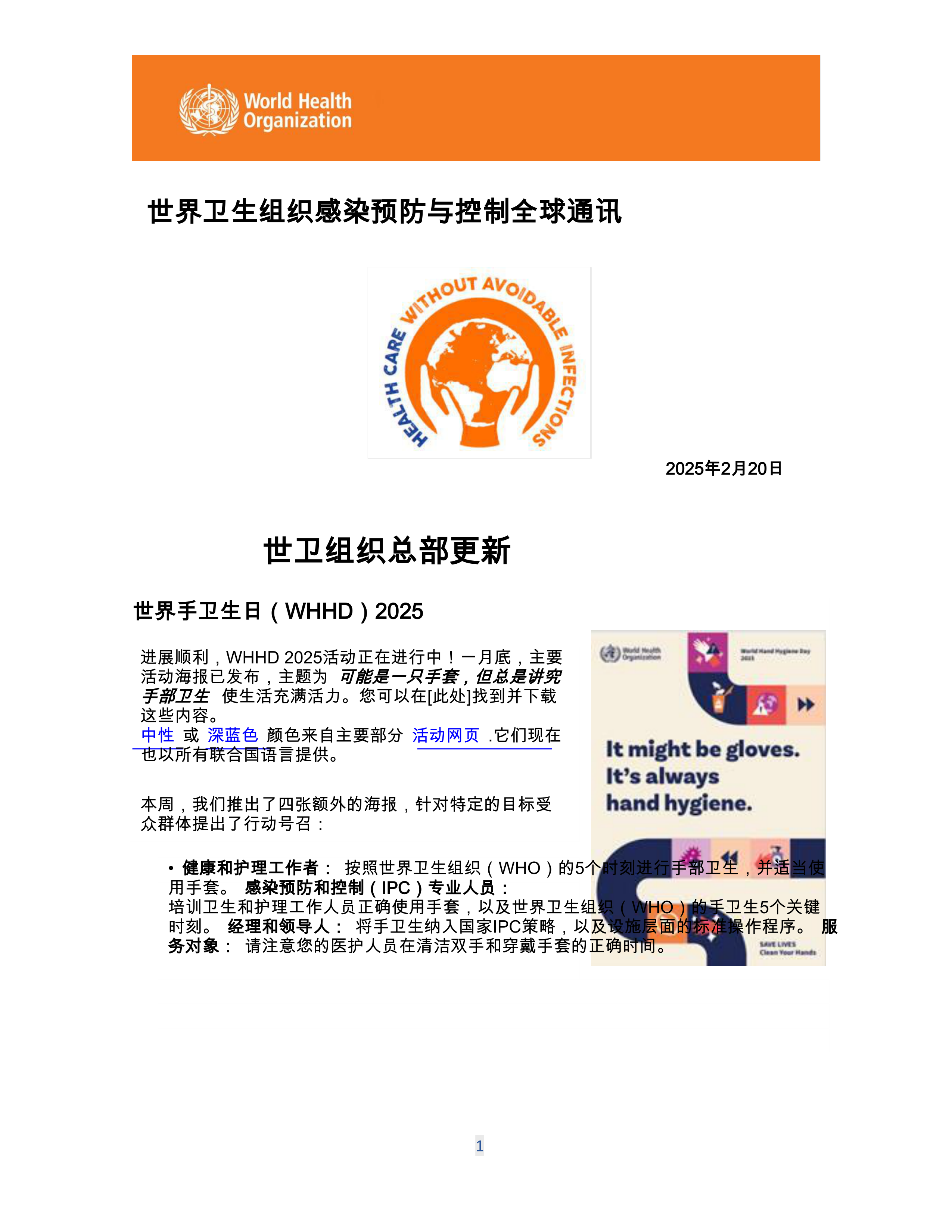 WHO已发布WHHD 2025主题海报及针对不同目标群体(医护人员、IPC专业人员、管理人员和服务对象)的宣传海报,并计划于8月4日和5月5日举办网络研讨会,介绍活动概述、参与方式以及新的IPC预服务教育和培训课程。