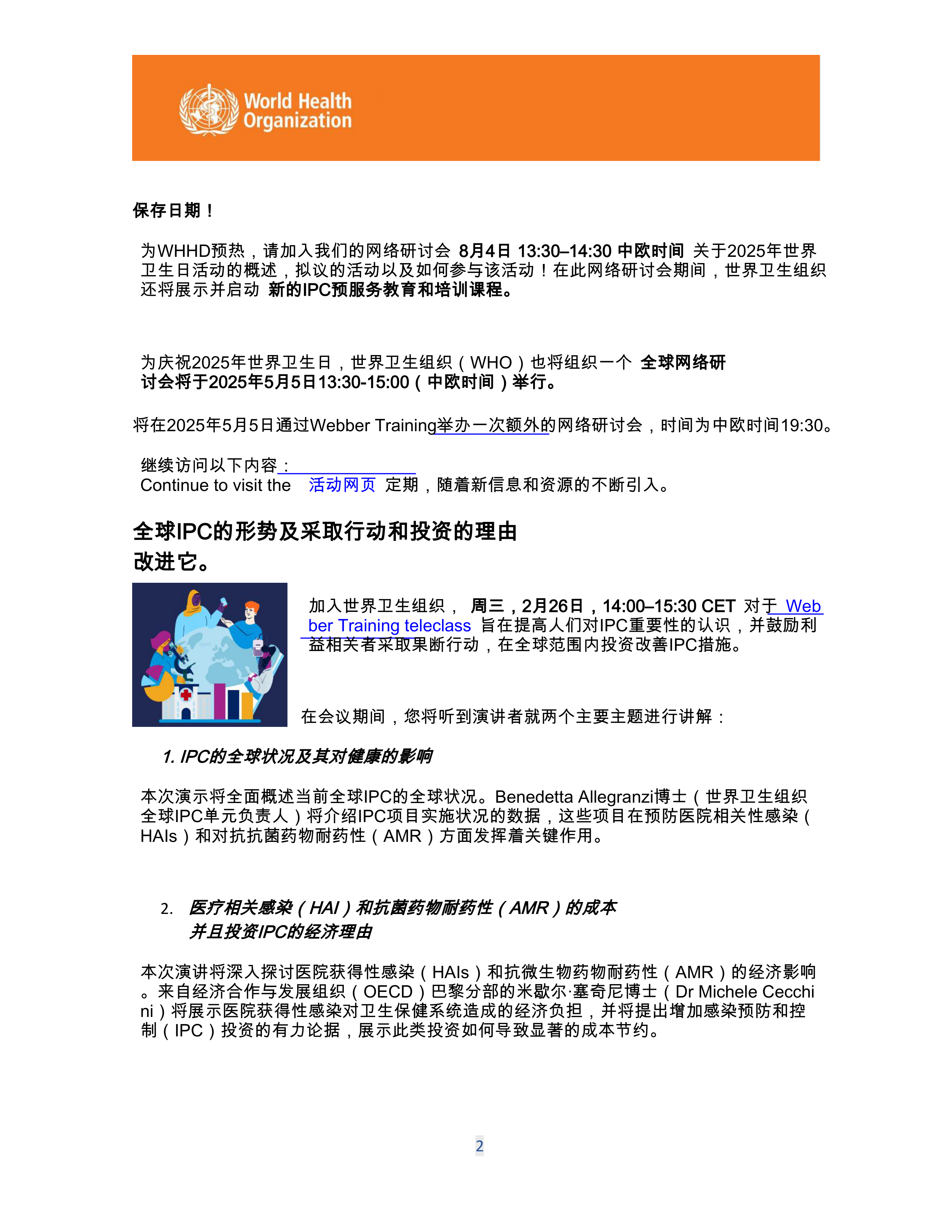 将在2025年5月5日通过WebberTraining举办一次额外的网络研讨会,时间为中欧时间19:30。为WHHD预热,请加入我们的网络研讨会8月4日13:30–14:30中欧时间关于2025年世界卫生日活动的概述,拟议的活动以及如何参与该活动!在此网络研讨会期间,世界卫生组织还将展示并启动新的IPC预服务教育和培训课程。