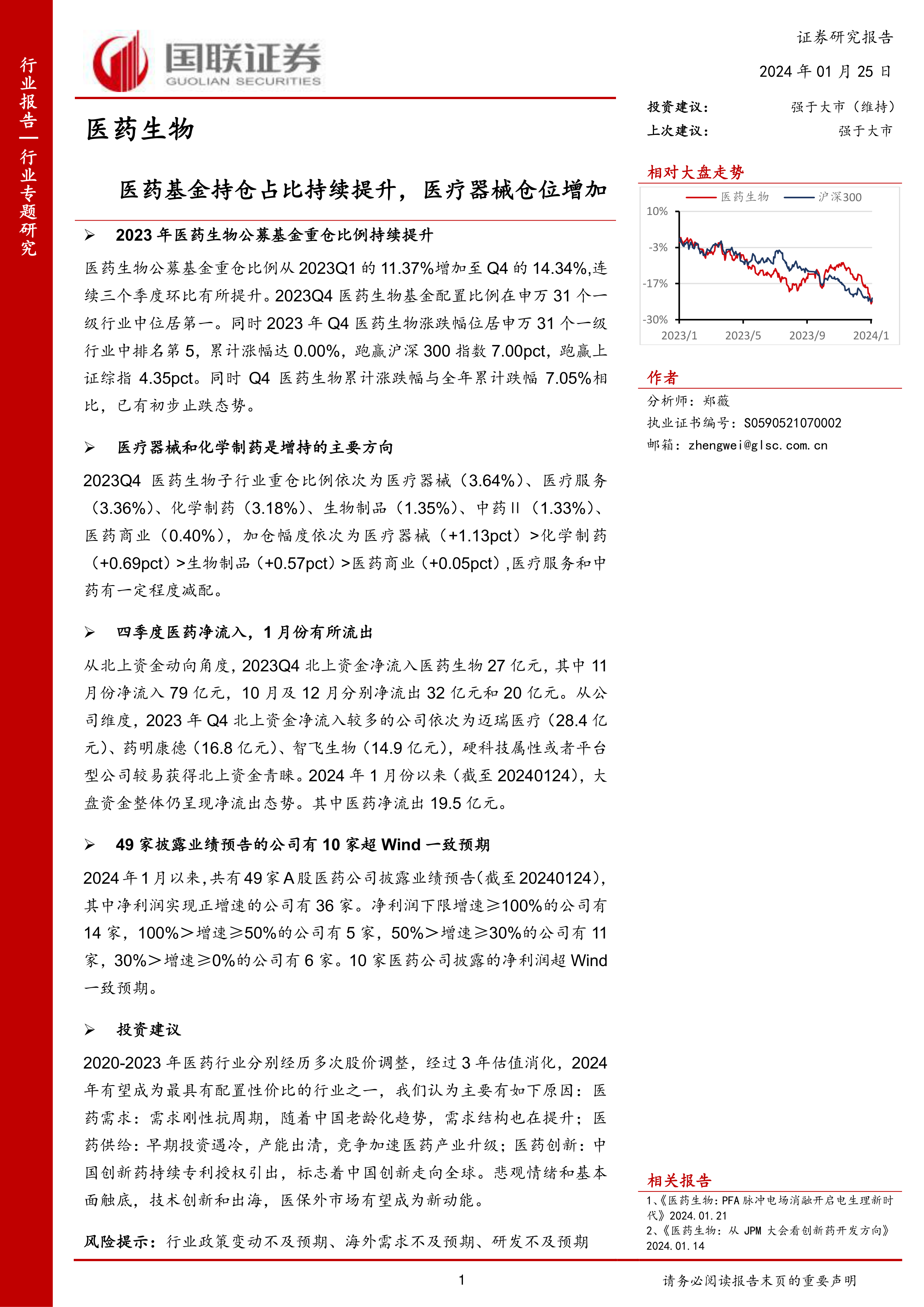 2023年,医药生物公募基金重仓比例持续提升,从Q1的11.37%上升至Q4的14.34%,连续三个季度环比增长,并在申万31个一级行业中排名第一。Q4医药生物行业涨幅排名第五,跑赢沪深300指数7.00pct和上证综指4.35pct,显示出市场对该行业的信心回升。