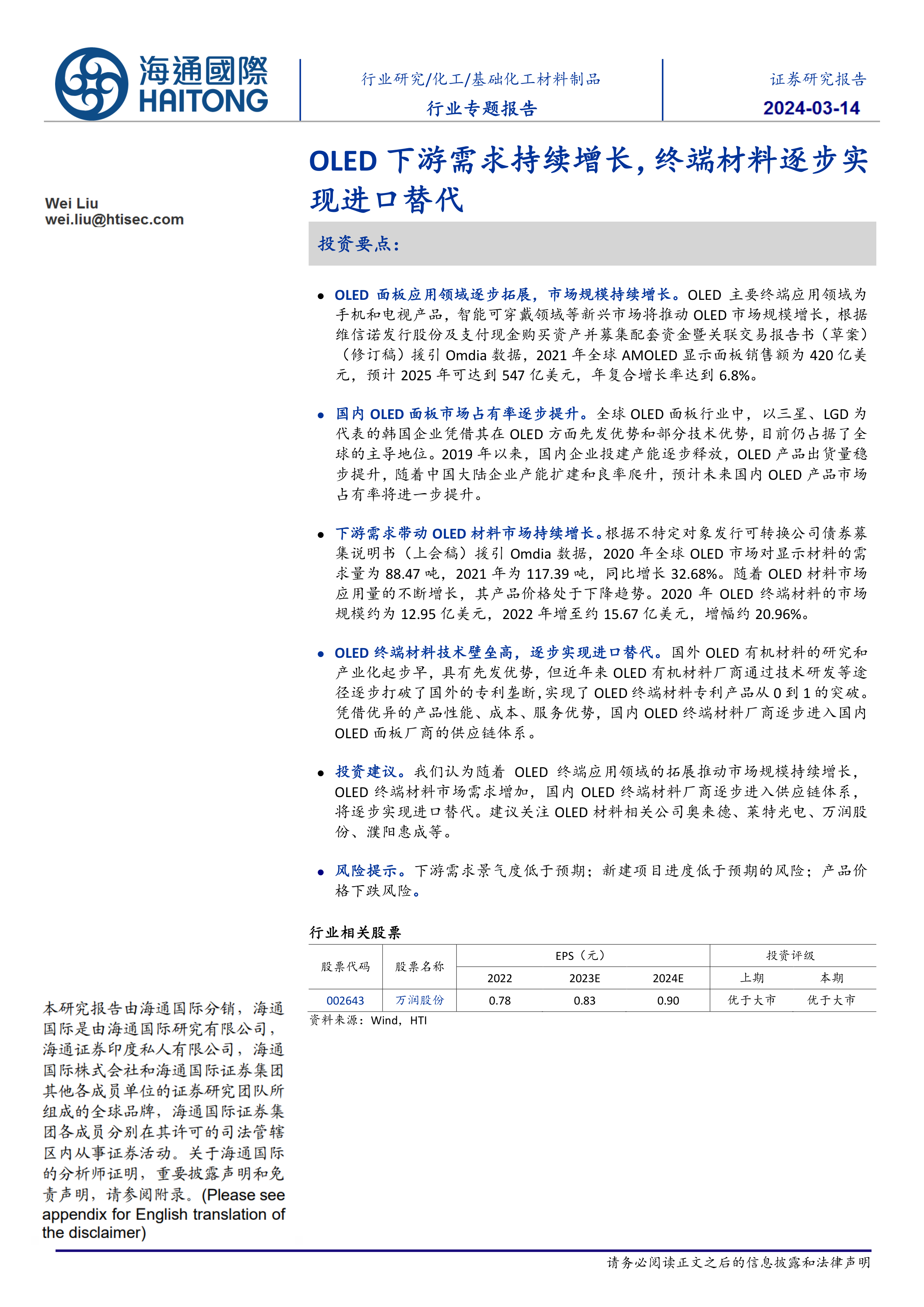 基础化工材料制品行业专题报告:OLED下游需求持续增长,终端材料逐步实现进口替代