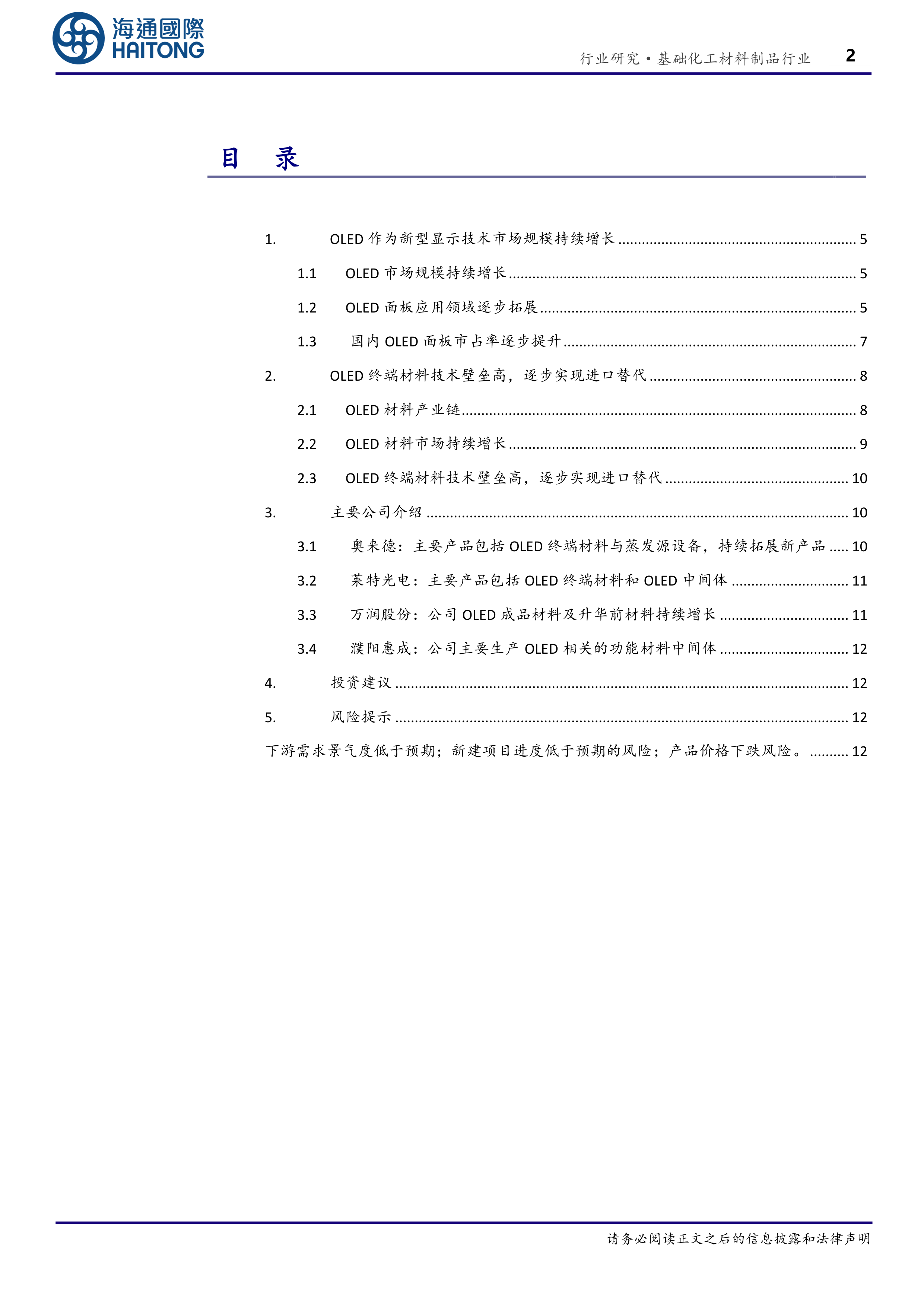 本报告的核心观点是:OLED显示技术市场规模持续增长,下游需求旺盛,带动OLED终端材料市场持续扩张。同时,国内OLED终端材料厂商在技术突破和国产替代方面取得显著进展,未来发展潜力巨大。建议关注相关上市公司投资机会,但需警惕下游需求波动、项目进度不及预期以及产品价格下跌等风险。
