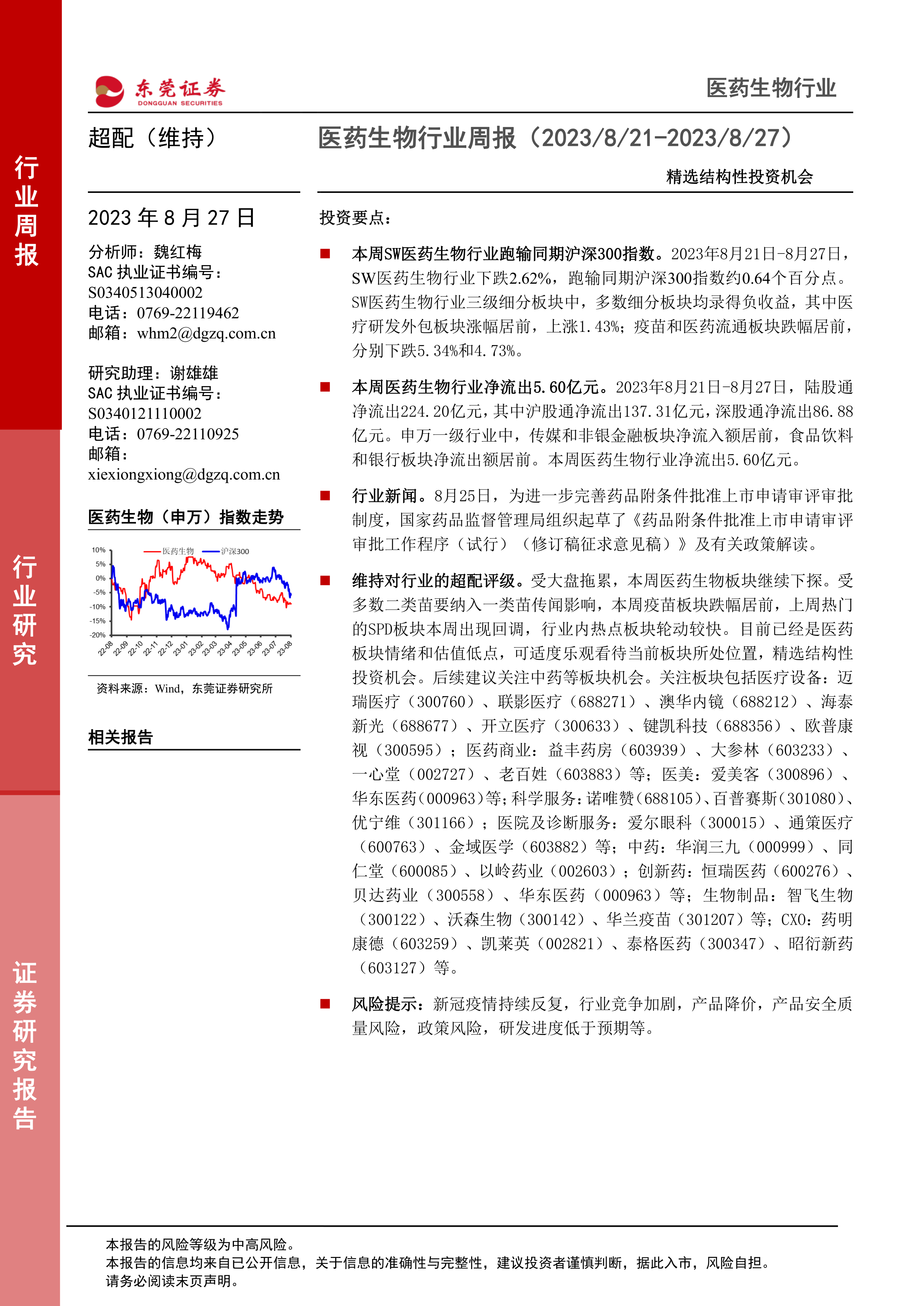 本报告基于公开信息,对2023年8月21日至2027日的SW医药生物行业进行了周度回顾和分析。报告指出,尽管本周医药生物行业整体表现疲软,跑输沪深300指数,且陆股通资金净流出,但行业估值已处于相对低位,部分细分领域仍存在结构性投资机会。报告建议投资者关注中药等板块,并列出了具体的建议关注标的,同时提醒投资者需注意各种潜在的风险因素,谨慎决策,风险自担。 报告的风险等级为中高风险,投资者需根据自身风险承受能力进行投资。