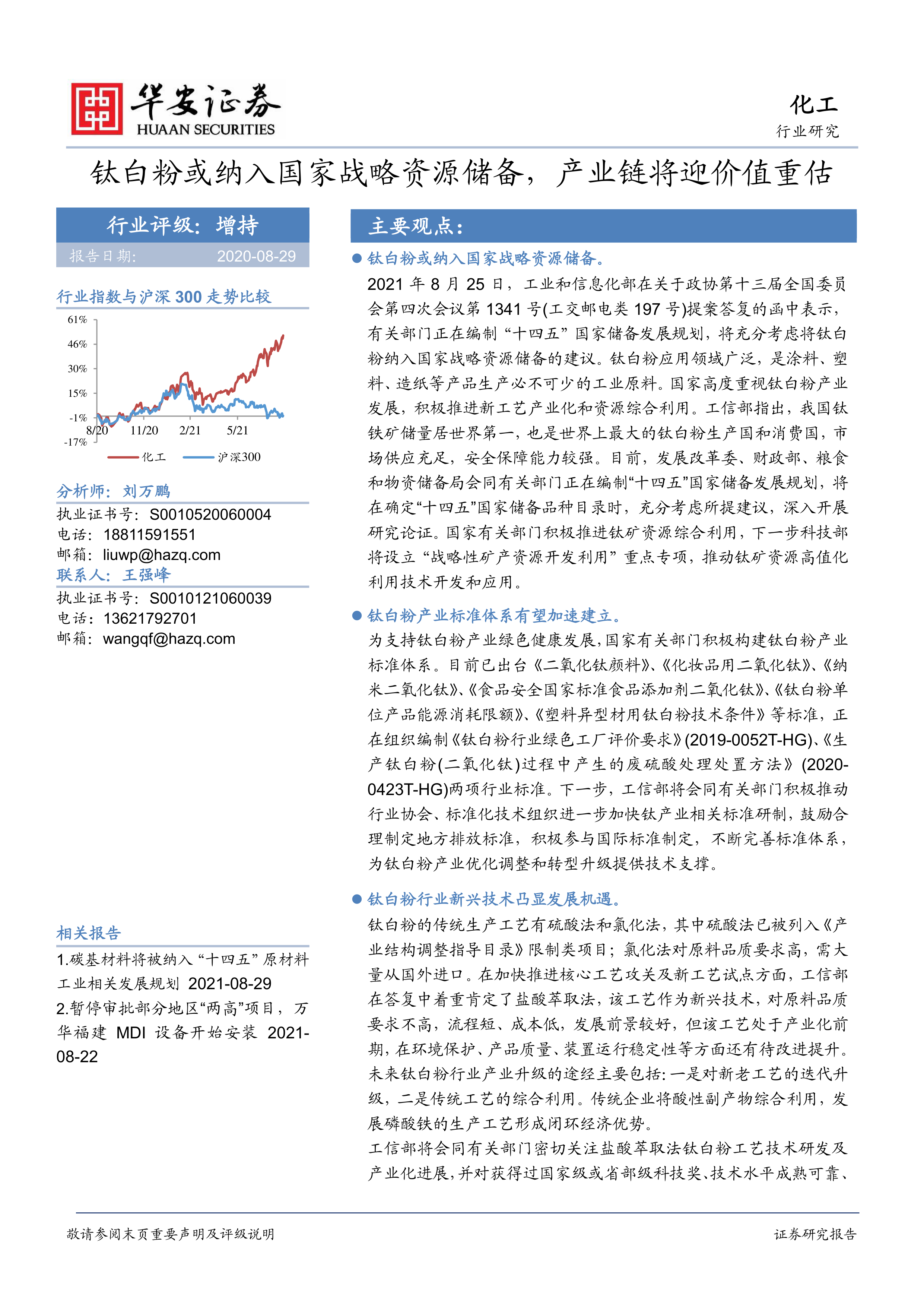 2021 年 8 月 25 日, 工业和信息化部在关于政协第十三届全国委员会第四次会议第 1341 号(工交邮电类 197 号)提案答复的函中表示,有关部门正在编制“十四五”国家储备发展规划,将充分考虑将钛白粉纳入国家战略资源储备的建议。 钛白粉应用领域广泛,是涂料、塑料、造纸等产品生产必不可少的工业原料。国家高度重视钛白粉产业发展,积极推进新工艺产业化和资源综合利用。 工信部指出,我国钛铁矿储量居世界第一,也是世界上最大的钛白粉生产国和消费国,市场供应充足,安全保障能力较强。目前,发展改革委、财政部、粮食和物资储备局会同有关部门正在编制“十四五”国家储备发展规划, 将在确定“十四五”国家储备品种目录时, 充分考虑所提建议, 深入开展研究论证。 国家有关部门积极推进钛矿资源综合利用,下一步科技部将设立“战略性矿产资源开发利用”重点专项,推动钛矿资源高值化利用技术开发和应用。