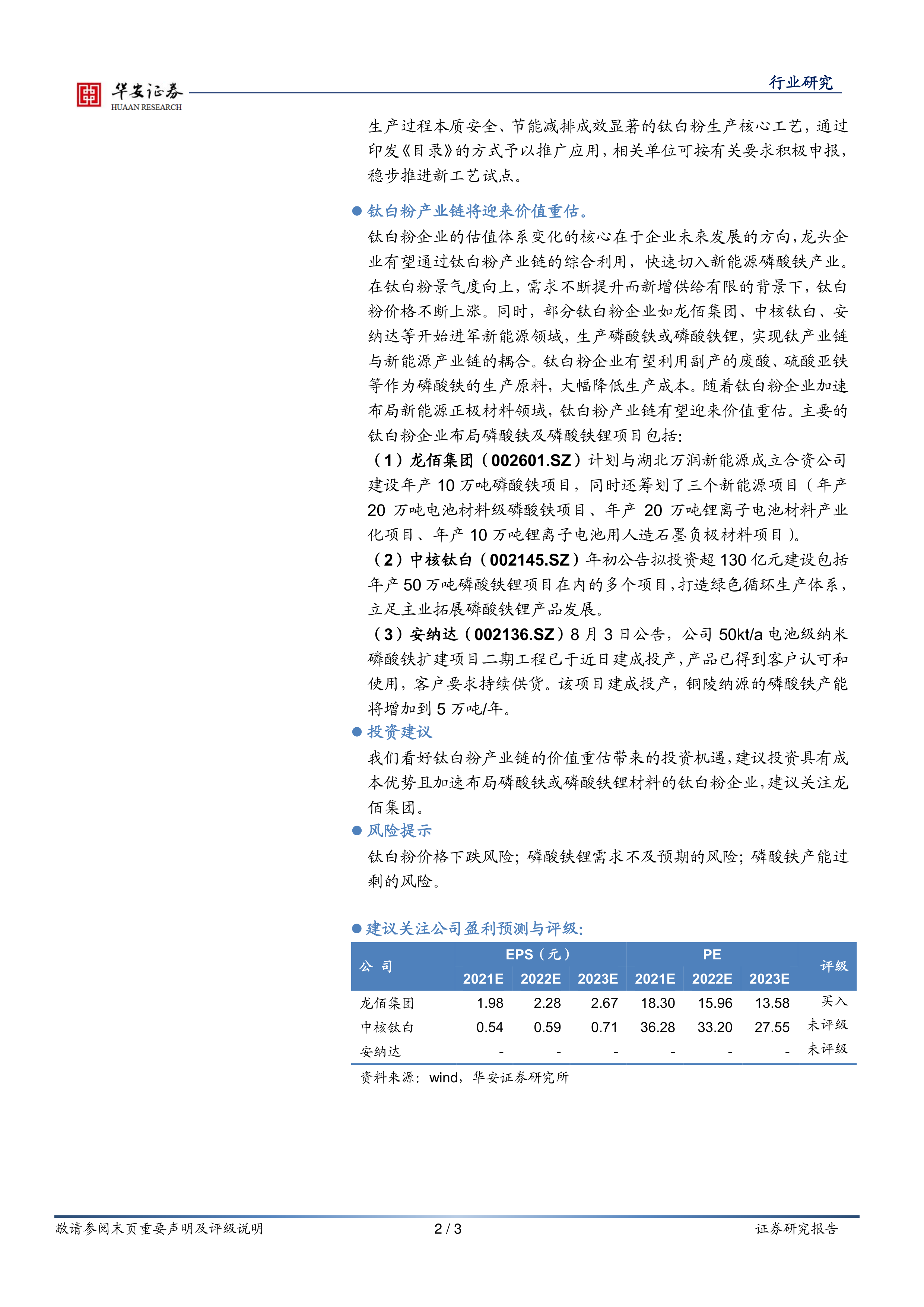 我们看好钛白粉产业链的价值重估带来的投资机遇, 建议投资具有成本优势且加速布局磷酸铁或磷酸铁锂材料的钛白粉企业,建议关注龙佰集团。