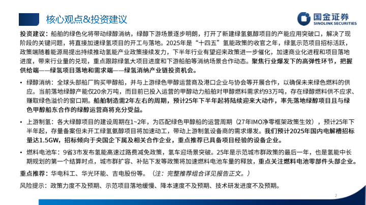 上游制氢:各大绿醇项目的建设周期在1~2年,为匹配绿色甲醇船的运营周期(27年IMO净零框架政策生效),预计25年下半年起,存量备案但未开工绿氢氨醇项目将加速动工,带动上游制氢设备商的需求爆发。我们预计2025年国内电解槽招标量达1.5GW,招标倾向于央国企下属及相关合作企业,重点推荐已具备项目经验的设备企业。燃料电池车:9省3市发布氢能高速过路费减免政策,氢车迎场景突破。25年是示范城市群政策的最后一年,也是氢能中长期规划的第一个结算时点,城市群扩容、补贴下发等政策将加速燃料电池车量的释放,重点关注燃料电池零部件头部企业。