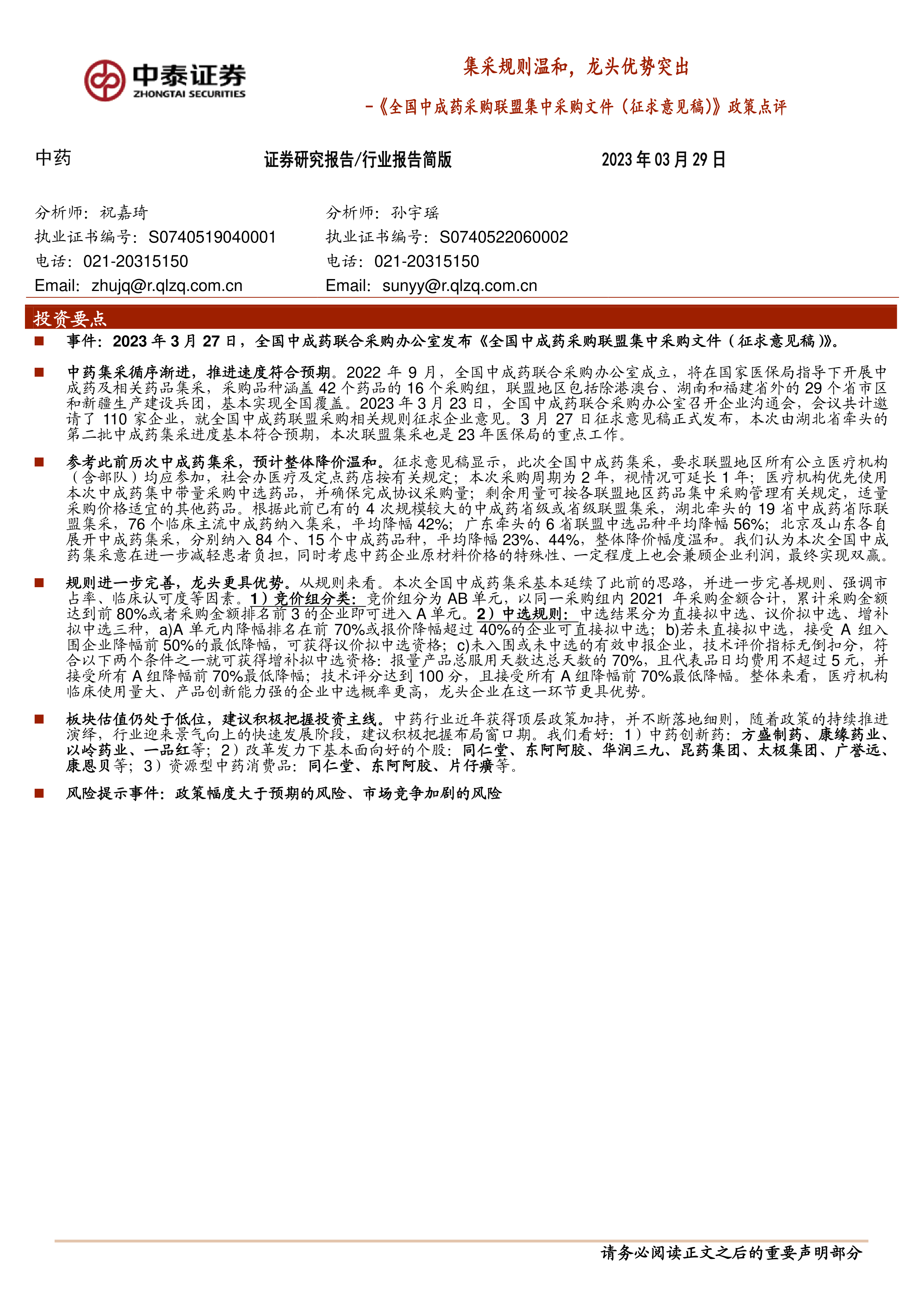 本报告的核心观点是:全国中成药集采规则温和,有利于龙头企业,整体降价幅度符合预期,行业发展前景向好。