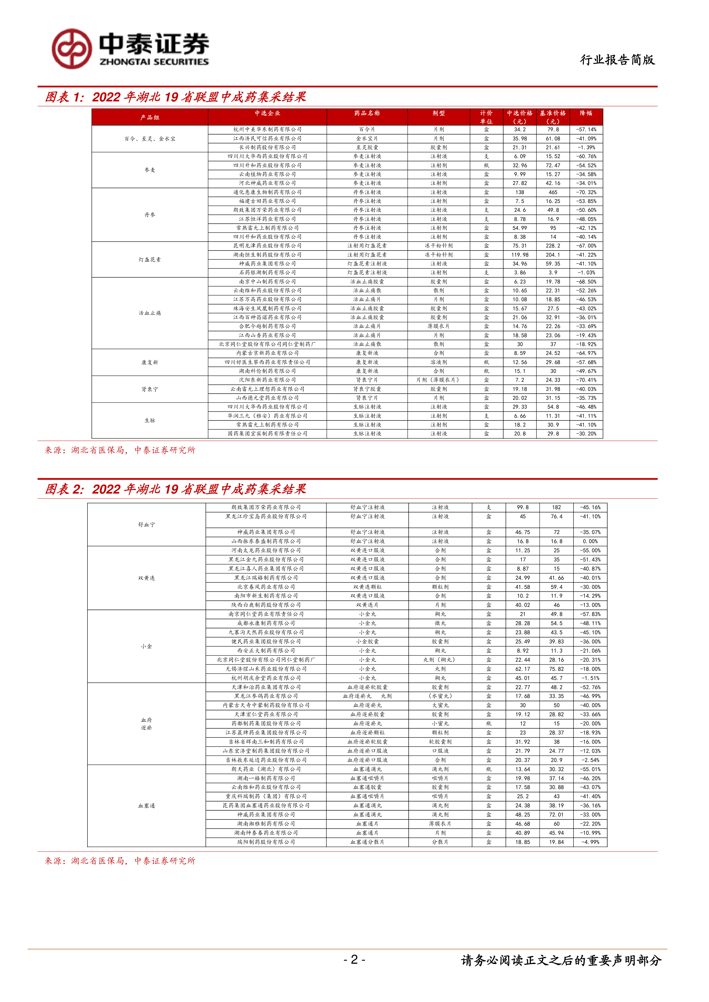 参考此前历次中成药集采,预计整体降价温和。征求意见稿显示,此次全国中成药集采,要求联盟地区所有公立医疗机构(含部队)均应参加,社会办医疗及定点药店按有关规定;本次采购周期为2年,视情况可延长1年;医疗机构优先使用本次中成药集中带量采购中选药品,并确保完成协议采购量;剩余用量可按各联盟地区药品集中采购管理有关规定,适量采购价格适宜的其他药品。根据此前已有的4次规模较大的中成药省级或省级联盟集采,湖北牵头的19省中成药省际联盟集采,76个临床主流中成药纳入集采,平均降幅42%;广东牵头的6省联盟中选品种平均降幅56%;北京及山东各自展开中成药集采,分别纳入84个、15个中成药品种,平均降幅23%、44%,整体降价幅度温和。我们认为本次全国中成药集采意在进一步减轻患者负担,同时考虑中药企业原材料价格的特殊性、一定程度上也会兼顾企业利润,最终实现双赢。
