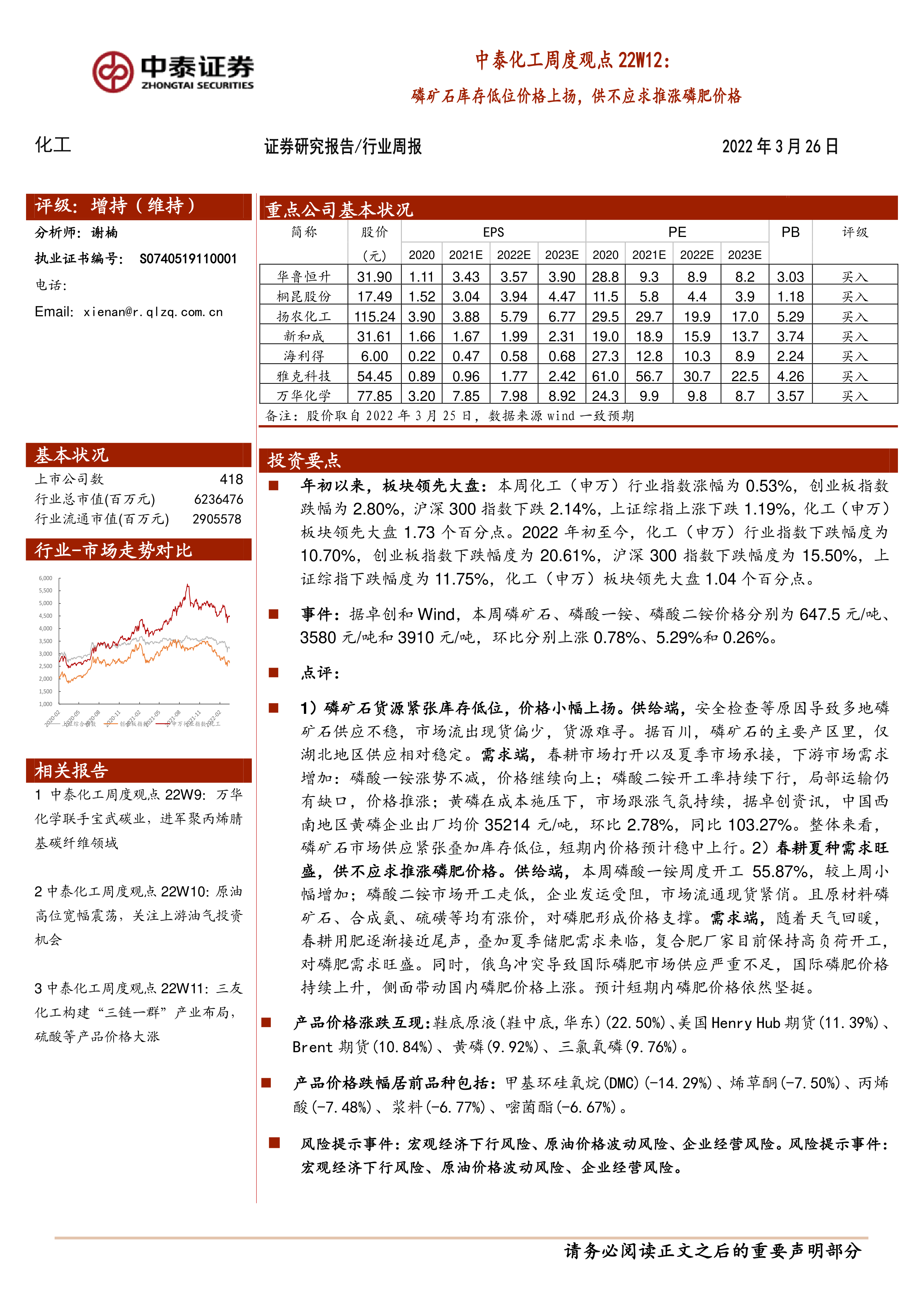 本报告的核心观点是:磷矿石库存低位、价格上扬,供不应求的市场格局推高了磷肥价格,短期内磷肥价格预计将保持坚挺。同时,报告分析了化工板块整体表现及个股表现,并对部分重点公司公告进行了解读。