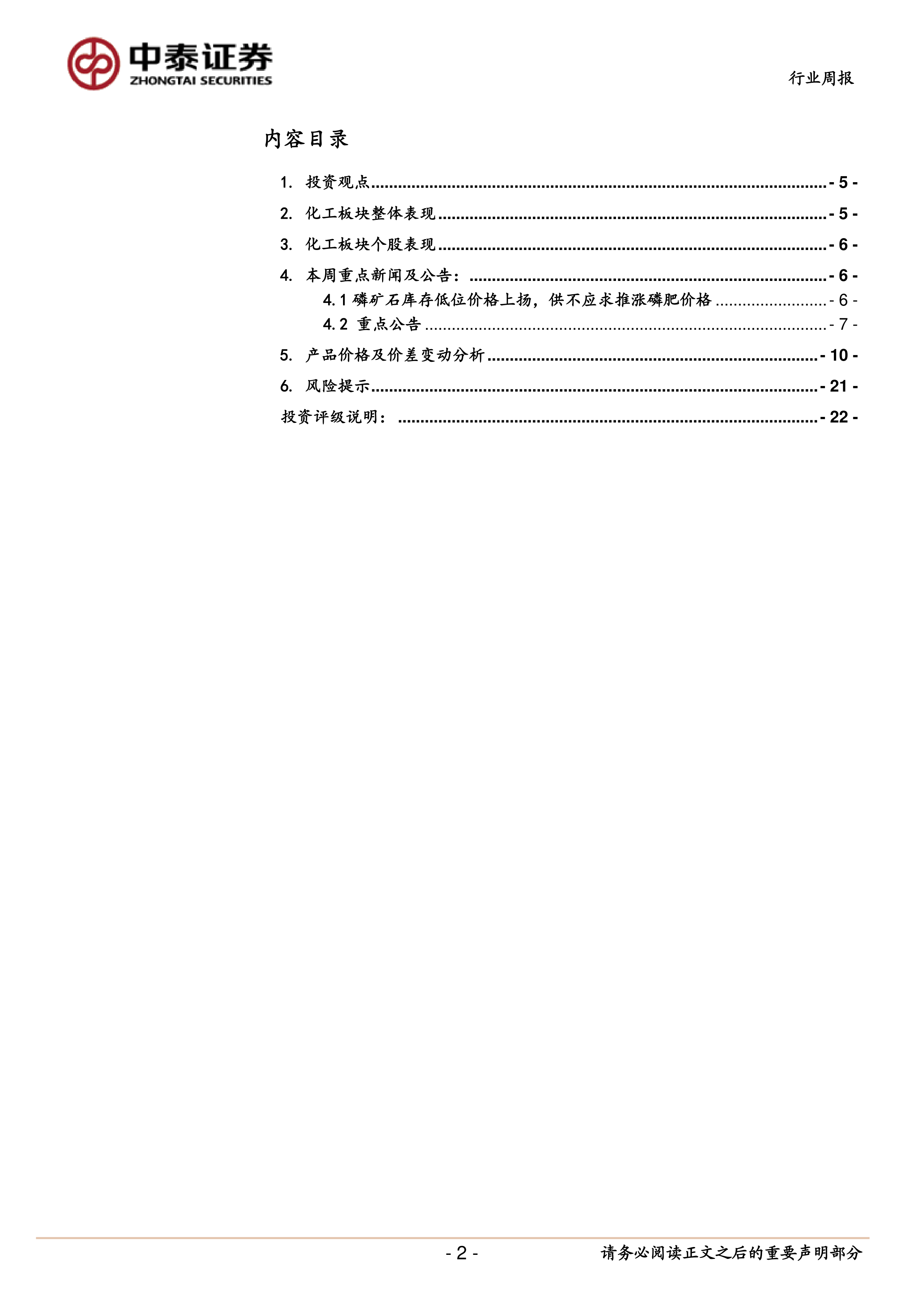 本报告通过对化工板块整体表现、个股表现、重点新闻及公告、产品价格及价差变动的分析,得出磷矿石库存低位、价格上扬,供不应求的市场格局推高了磷肥价格,短期内磷肥价格预计将保持坚挺的结论。报告还提示了化工行业面临的原油价格下跌和宏观经济下行风险,为投资者提供参考。 报告中提供的图表数据清晰地展现了化工市场动态,为投资者进行投资决策提供了重要的数据支持。 需要注意的是,报告中的信息和观点仅供参考,不构成投资建议,投资者应独立判断并承担投资风险。