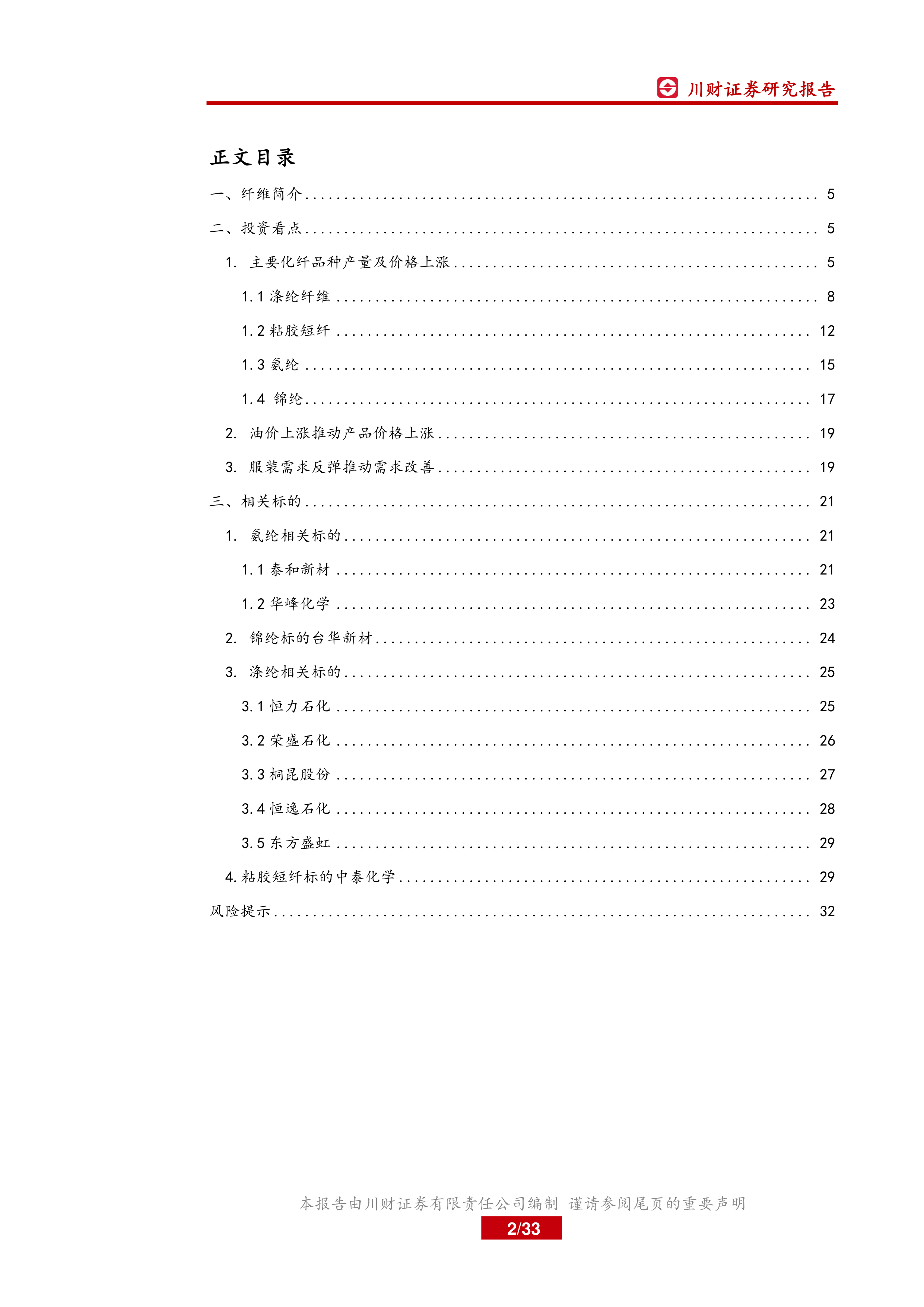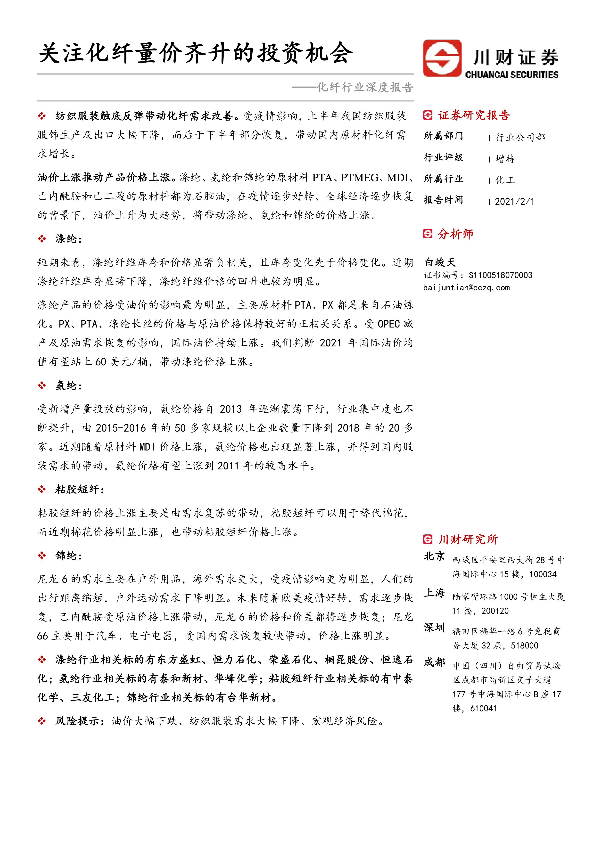 本报告基于对化纤行业市场供需、价格走势及相关上市公司的深入分析,认为化纤行业在纺织服装行业复苏和油价上涨的双重驱动下,将迎来量价齐升的良好发展机遇。投资者应关注相关上市公司的投资价值,但需同时注意油价大幅下跌、纺织服装需求大幅下降以及宏观经济风险等潜在风险。 报告中提供的公司分析并非投资建议,投资者需根据自身情况进行独立判断。
