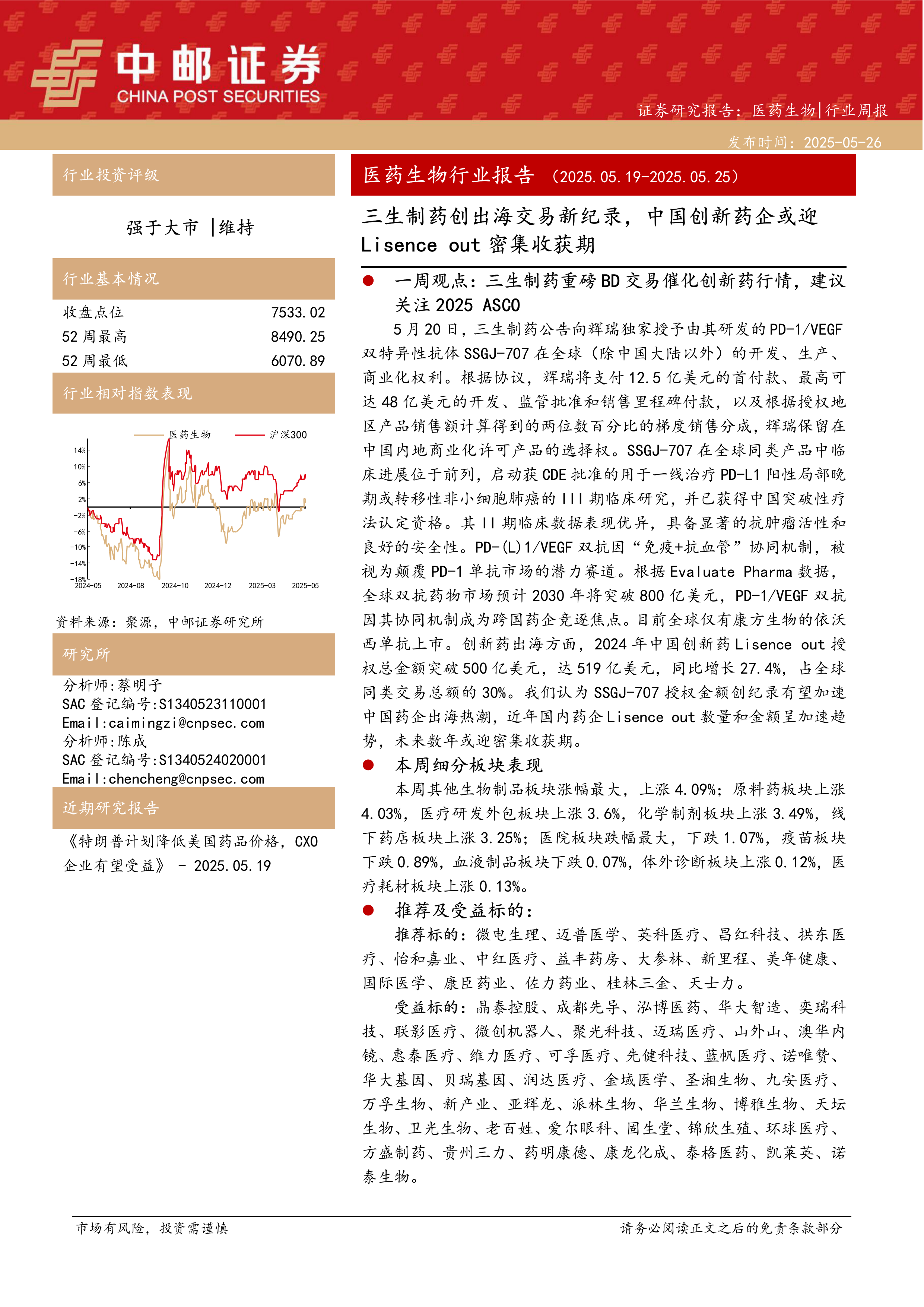 l一周观点:三生制药重磅BD交易催化创新药行情,建议关注2025ASCO