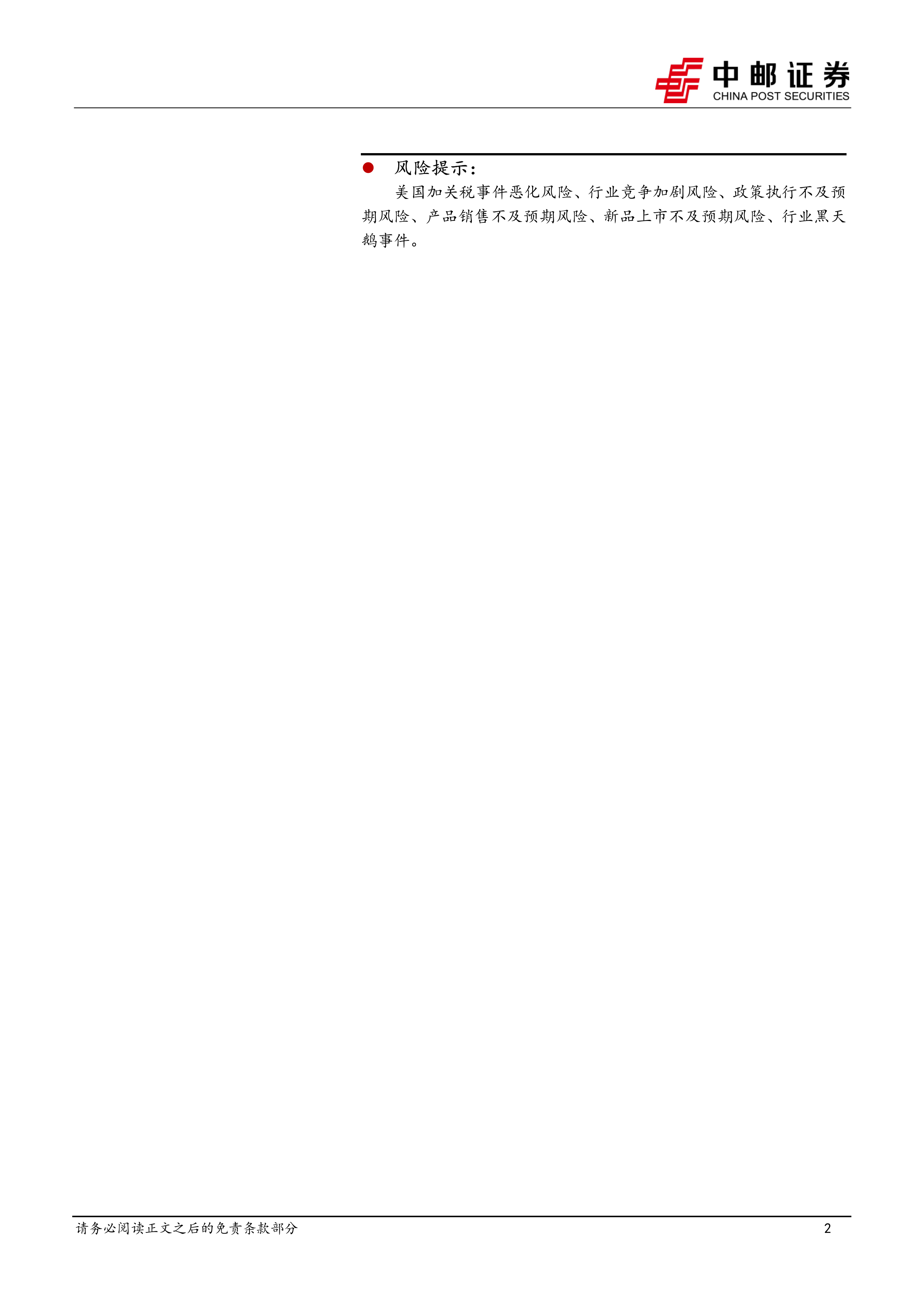 美国加关税事件恶化风险、行业竞争加剧风险、政策执行不及预期风险、产品销售不及预期风险、新品上市不及预期风险、行业黑天鹅事件。