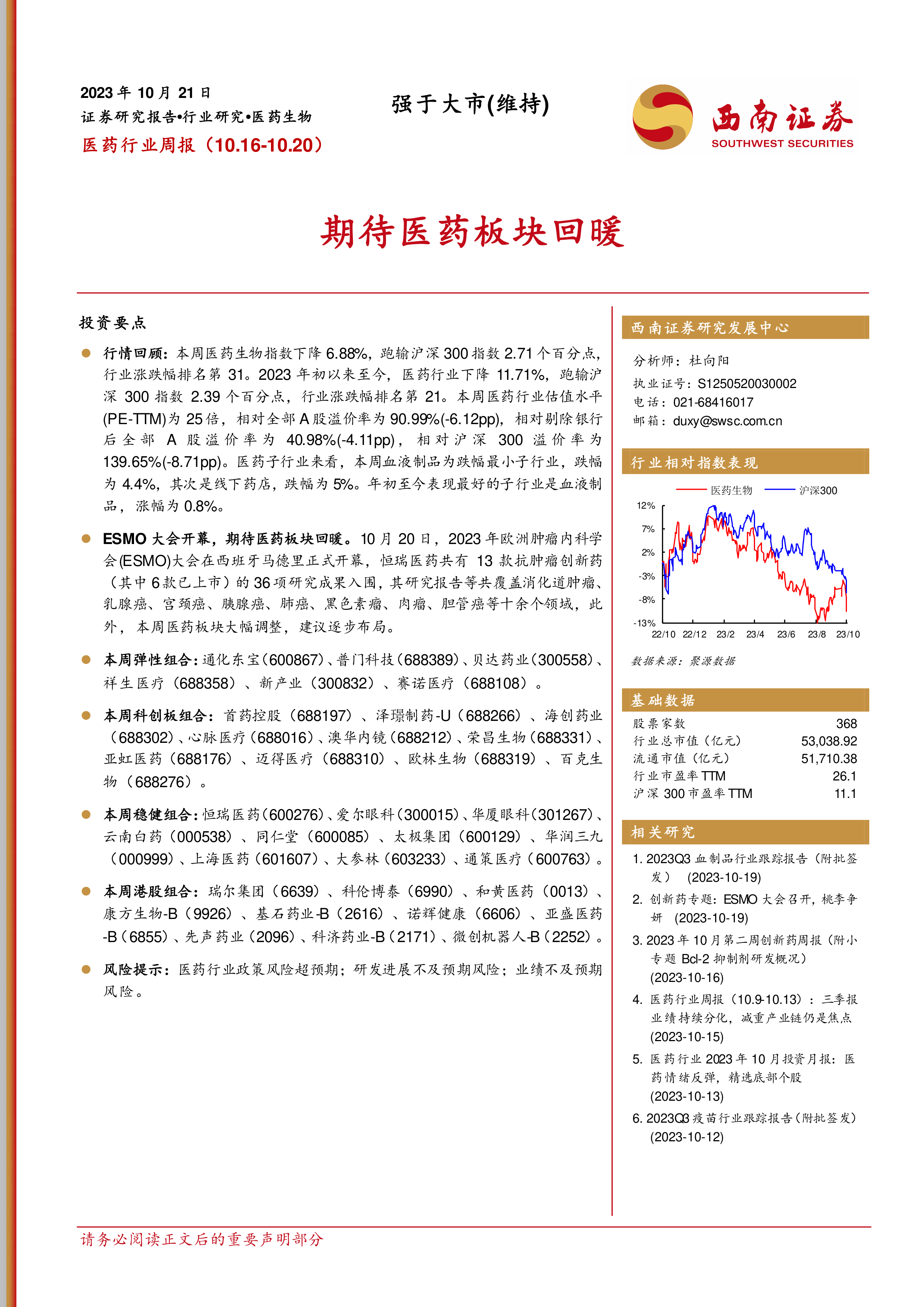 本报告对2023年10月16日至20日一周的医药行业进行了全面分析。 数据显示,本周医药行业整体表现弱于大盘,但ESMO大会的召开为板块回暖带来预期。 报告建议投资者逐步布局医药板块,并提供了不同风险偏好的投资组合建议。 报告还对医药行业二级市场表现、最新政策及新闻、以及相关研究报告进行了详细的总结,为投资者提供了全面的市场信息和分析。 需要注意的是,医药行业受政策、研发进展和市场情绪等多种因素影响,投资存在风险,投资者需谨慎决策。