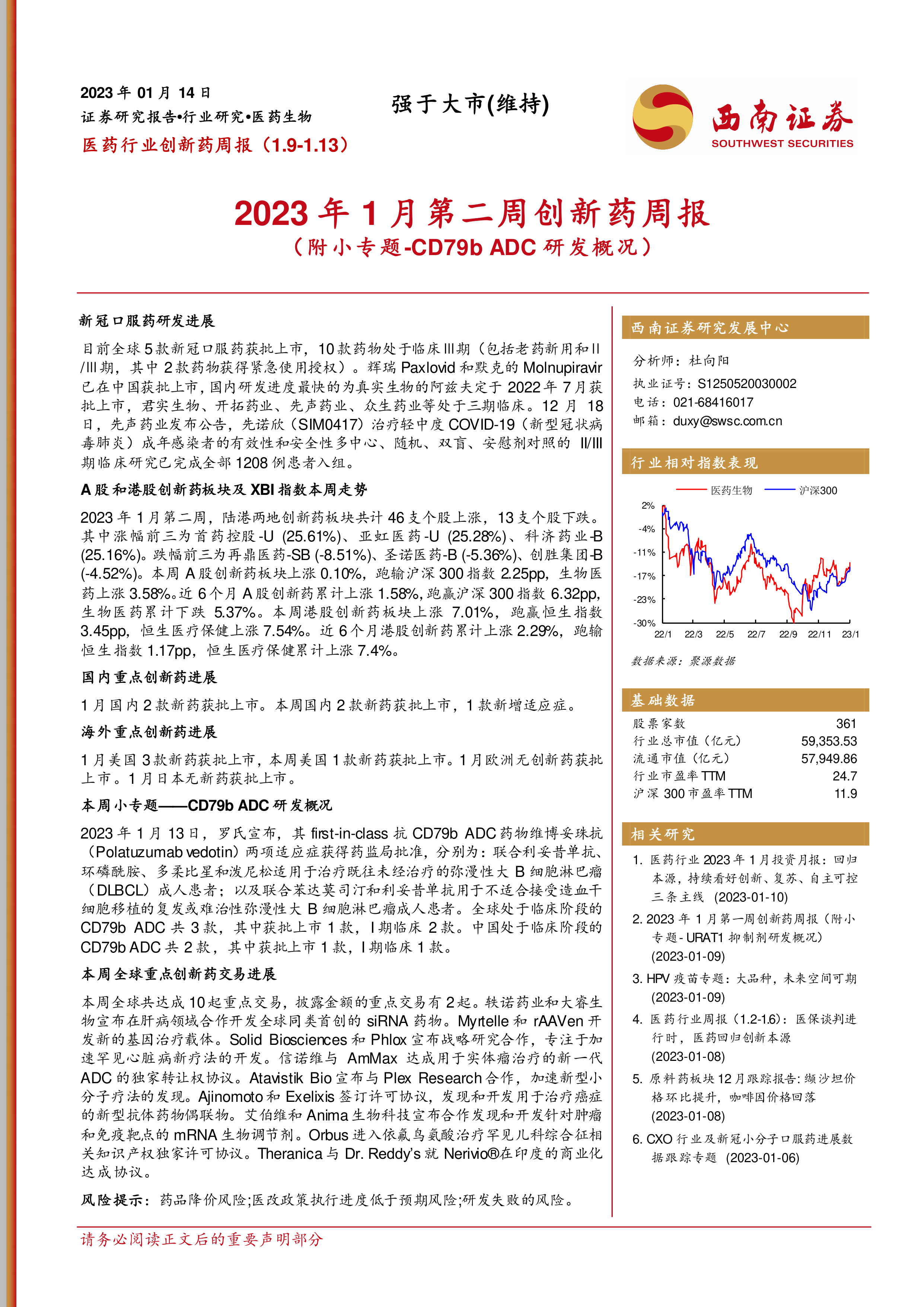 本报告通过对2023年1月第二周创新药市场表现、国内外创新药研发进展以及重点交易的分析,为投资者提供了较为全面的市场信息。报告指出,国内外创新药市场表现存在差异,国内研发进展迅速,多个新药获批上市或进入临床后期阶段,CD79b ADC领域取得突破性进展,市场交易活跃。投资者需密切关注市场动态,谨慎投资。 报告也提示了药品降价、医改政策以及研发失败等风险。