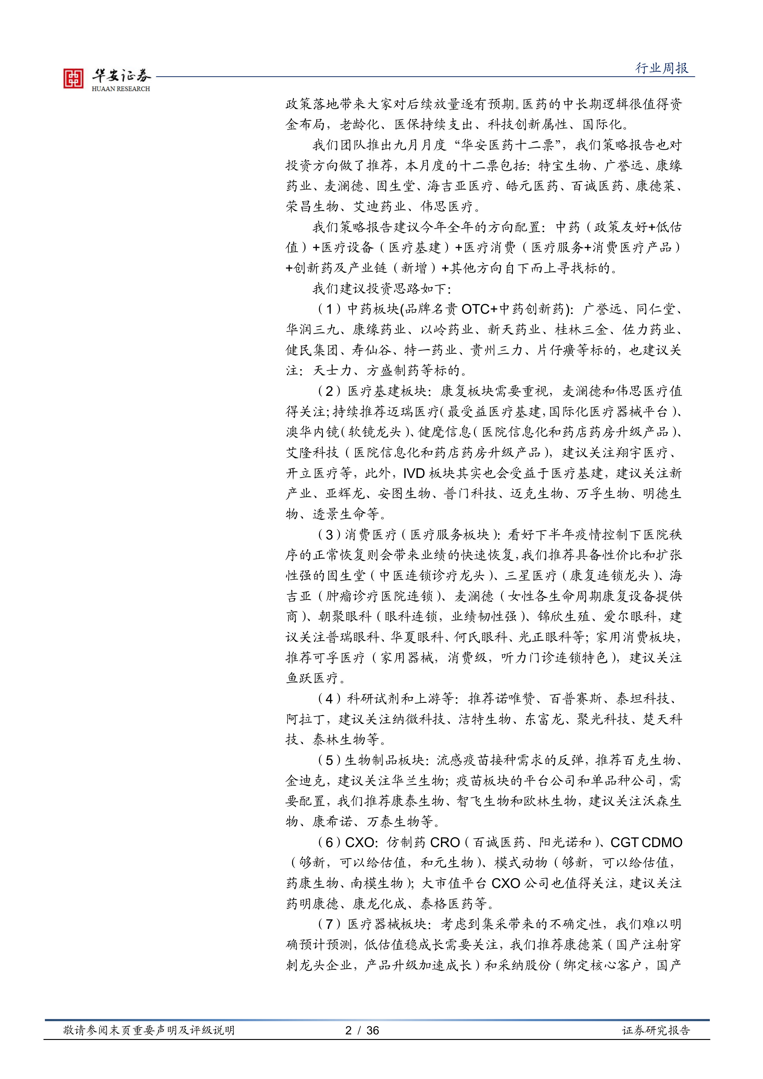 我们团队推出九月月度“华安医药十二票”,我们策略报告也对投资方向做了推荐,本月度的十二票包括:特宝生物、广誉远、康缘药业、麦澜德、固生堂、海吉亚医疗、皓元医药、百诚医药、康德莱、荣昌生物、艾迪药业、伟思医疗。