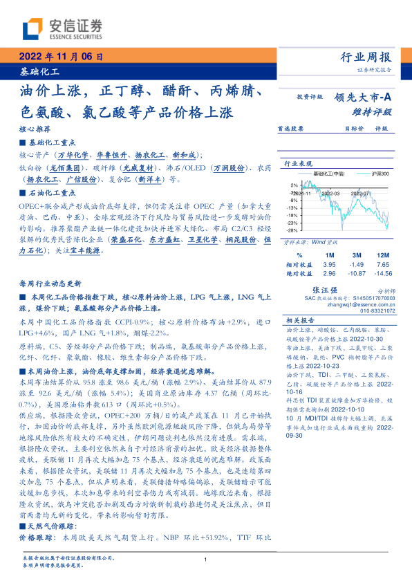基础化工行业周报:油价上涨,正丁醇、醋酐、丙烯腈、色氨酸、氯乙酸等产品价格上涨