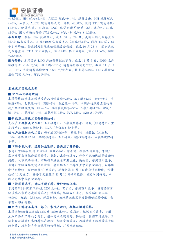 国内价格:本周国内LNG产地价格继续下行。截至11月3日,LNG主产地报价为5756元/吨,较上周-3.70%;消费地价格同向下行,截至11月3日,LNG主要消费地均价为6494元/吨左右,较上周-5.88%。LNG接收站报价7282元/吨,环比-5.44%。重点化工品观点更新: