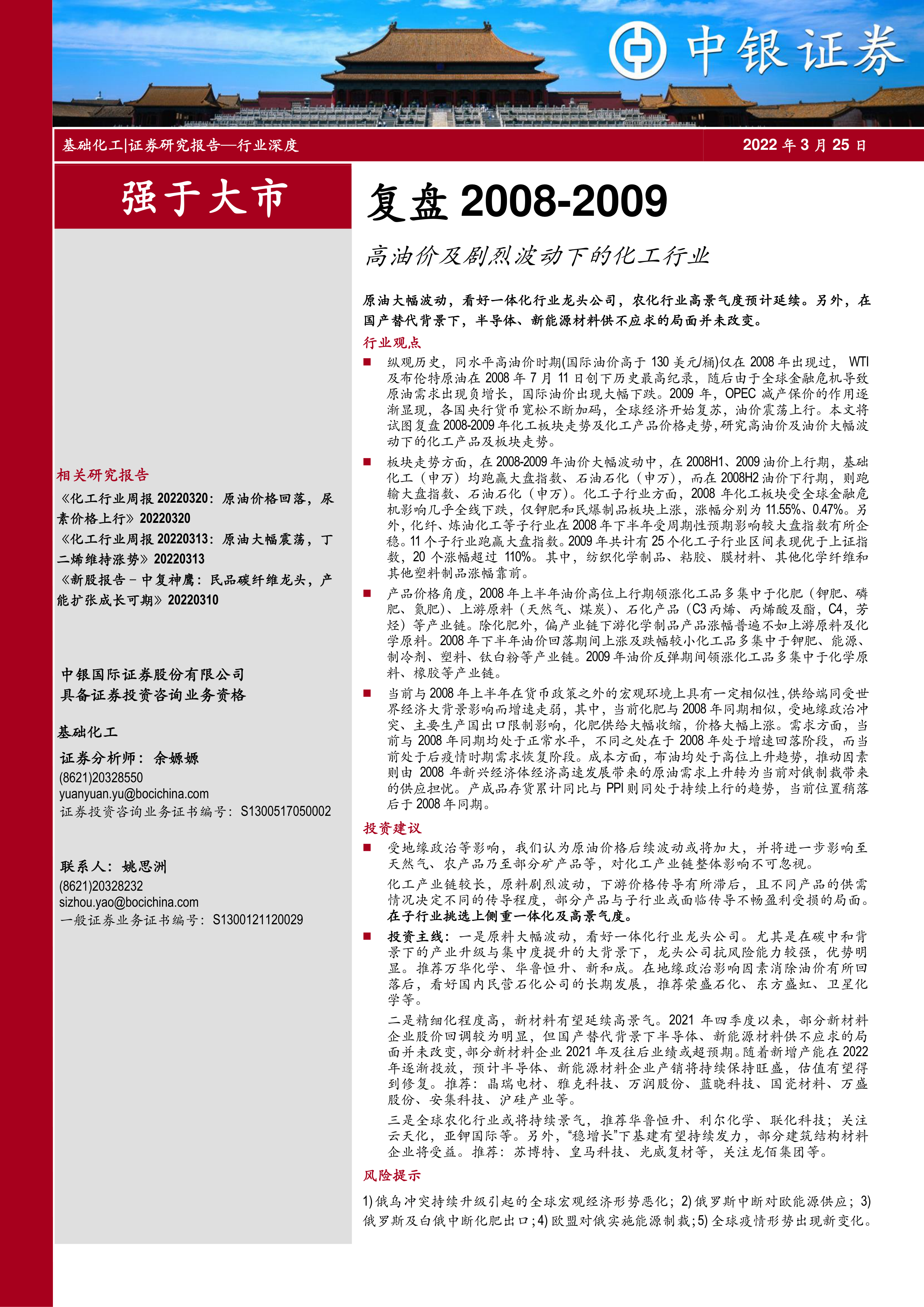 本报告的核心观点是:通过复盘2008-2009年高油价及剧烈波动下的化工行业表现,分析其板块走势、产品价格波动以及宏观经济环境的影响,为当前国际油价高位运行下的化工行业投资提供参考。主要结论包括: