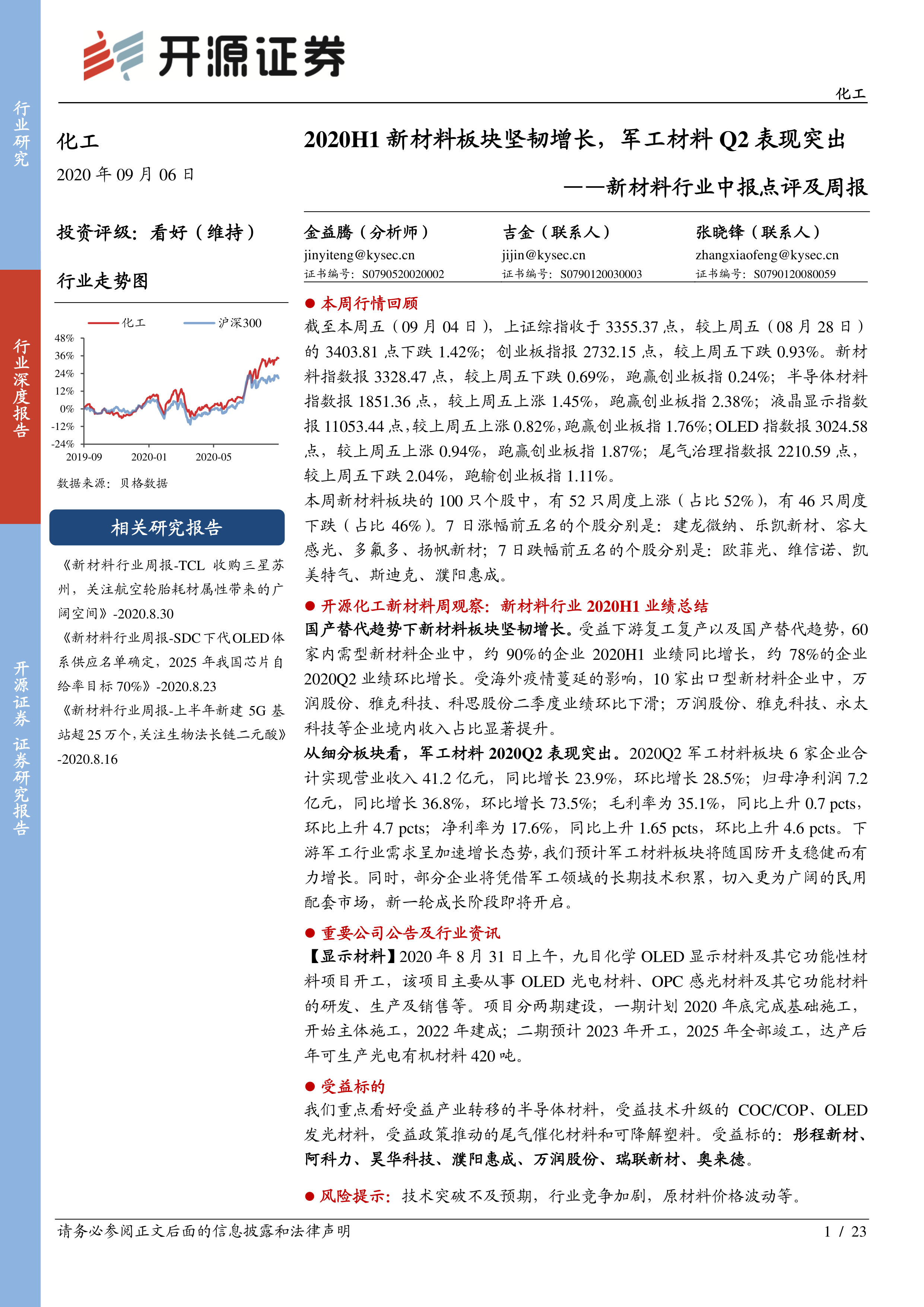 新材料行业中报点评及周报:2020H1新材料板块坚韧增长,军工材料Q2表现突出