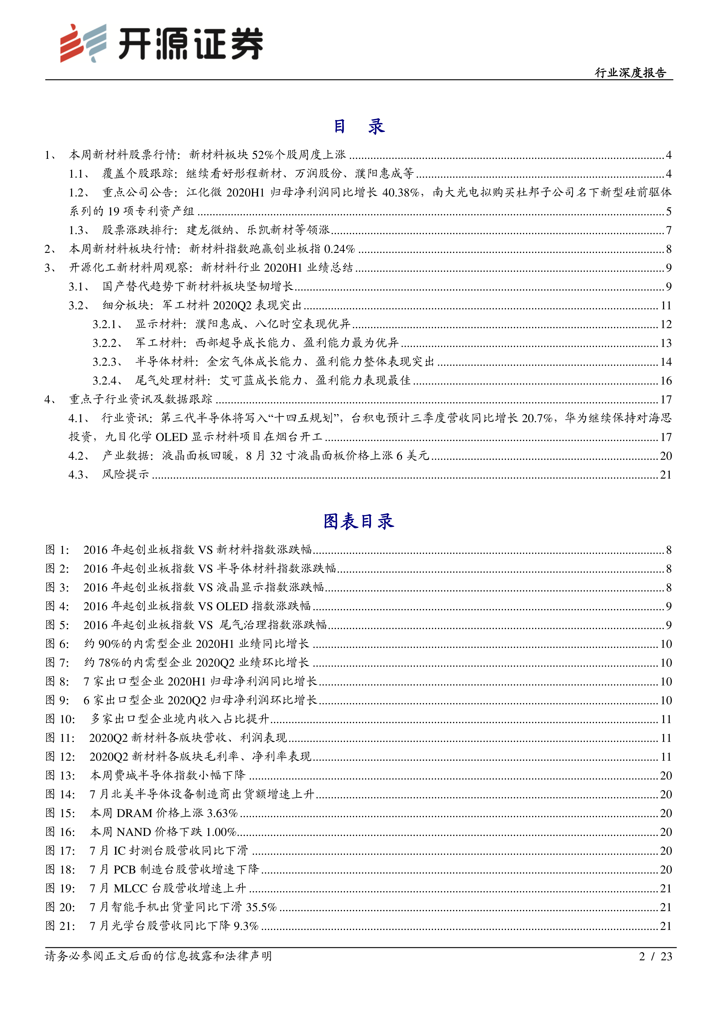 报告还跟踪了重要的行业资讯和产业数据,例如第三代半导体将写入“十四五规划”、台积电预计三季度营收同比增长20.7%、华为继续保持对海思投资、九目化学OLED显示材料项目在烟台开工等。此外,报告还提供了液晶面板回暖、DRAM价格上涨、NAND价格下跌等产业数据,并对这些信息对新材料行业的影响进行了分析。