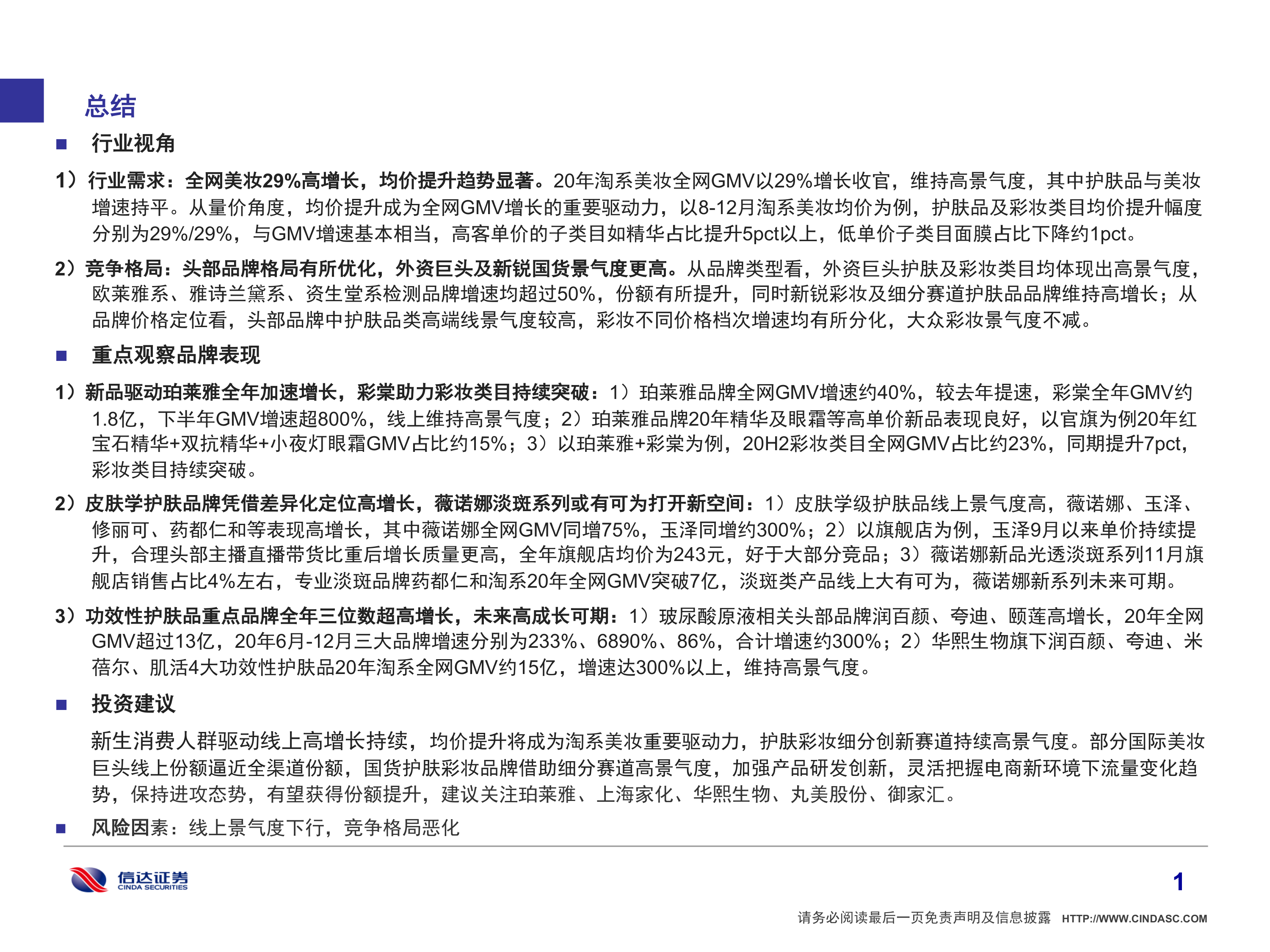 本报告的核心观点是:2020年淘系美妆市场保持高景气度,全网GMV同比增长29%,均价提升是重要驱动力。头部品牌格局优化,外资巨头和新锐国货品牌表现突出,细分赛道(如皮肤学护肤、功效性护肤、淡斑产品)景气度更高,为国货品牌提供了进攻机会。建议关注珀莱雅、上海家化、华熙生物、丸美股份、御家汇等公司。