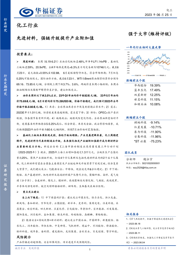 本报告的核心观点是:化工行业本周表现分化,石油石化板块表现好于大盘,基础化工板块表现弱于大盘。油价中枢稳定,预计2023年全年价格中枢在80美元/桶。先进材料成为化工行业新的增长点,产业链附加值提升成为重要方向。建议关注能源安全、中下游盈利扩张以及新兴材料等投资机会。