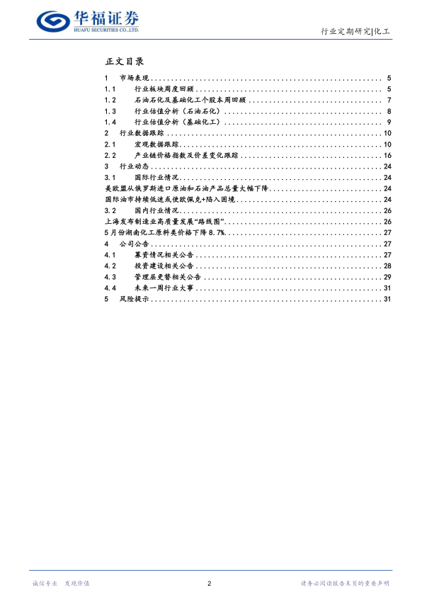 周度回顾: 本周(6.19-6.21)石油石化板块-2.48%,市净率LF1.14xPB , 基础化工板块-2.59%, 20.9xPE, 全A市场热度周度+6.3%至日均交易额为10746亿元。截至6月23日,美元指数+0.55%至102.88, 6月美联储暂停加息,符合市场预期; 7月加息0.25%可能性较大。国际油价方面,截至6月23日, WTI与Brent原油期货结算价分别为69.16、 73.85美元/桶,分别较上周下跌3.7%、 3.6%, 两地价差本周小幅收缩。 本周石脑油制烯烃及煤制甲醇等价差扩张,建议积极关注。