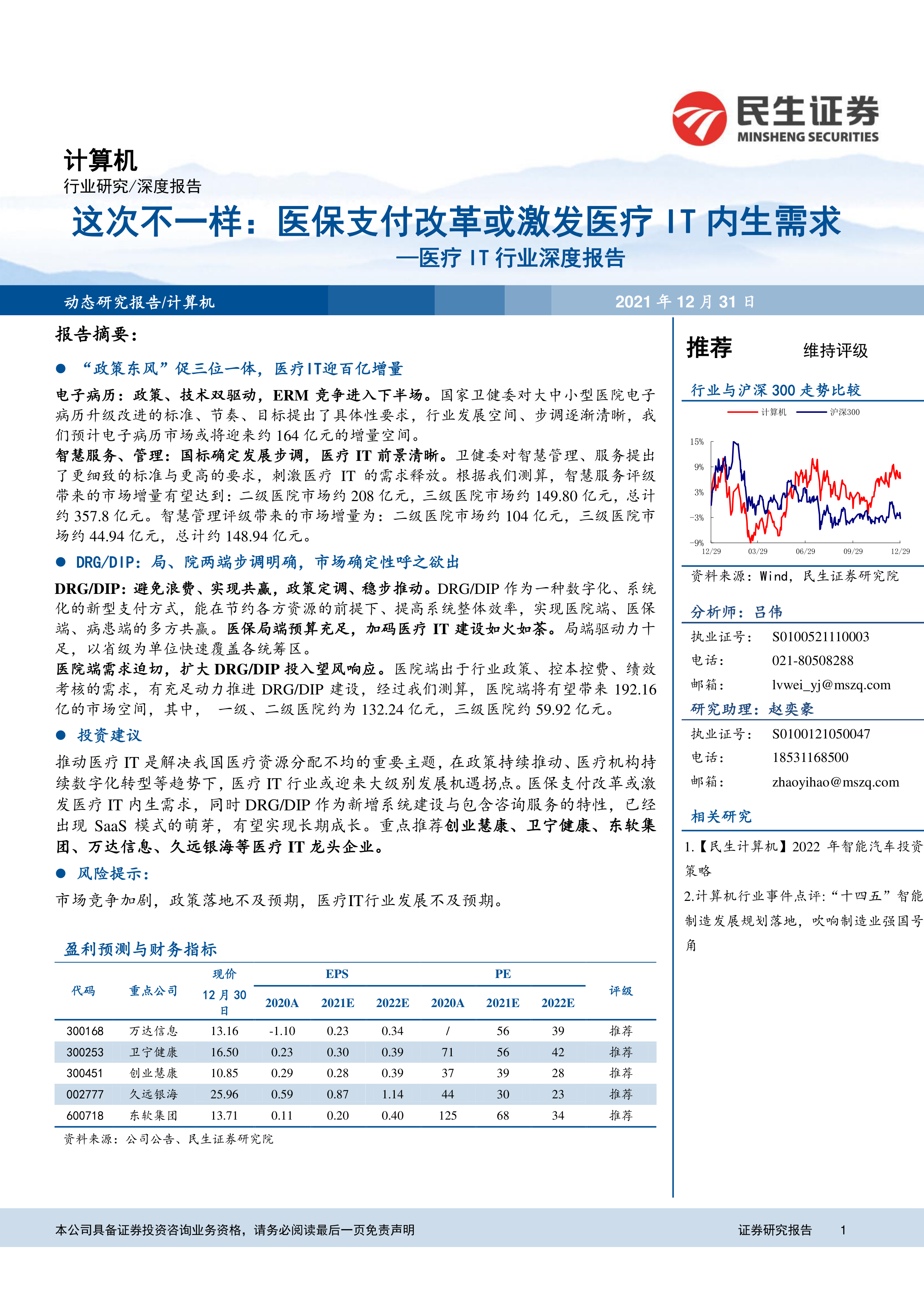 本报告基于对国家政策和市场需求的深入分析,预测医保支付改革将极大激发医疗IT的内生需求,为医疗IT行业带来巨大的发展机遇。 “三位一体”智慧医院建设和DRG/DIP支付方式改革将分别带来数百亿元的市场增量。 报告重点推荐了五家医疗IT龙头企业,但同时也提示了市场竞争加剧、政策落地不及预期以及行业发展不及预期的风险。 投资者应谨慎评估风险,做出独立的投资决策。